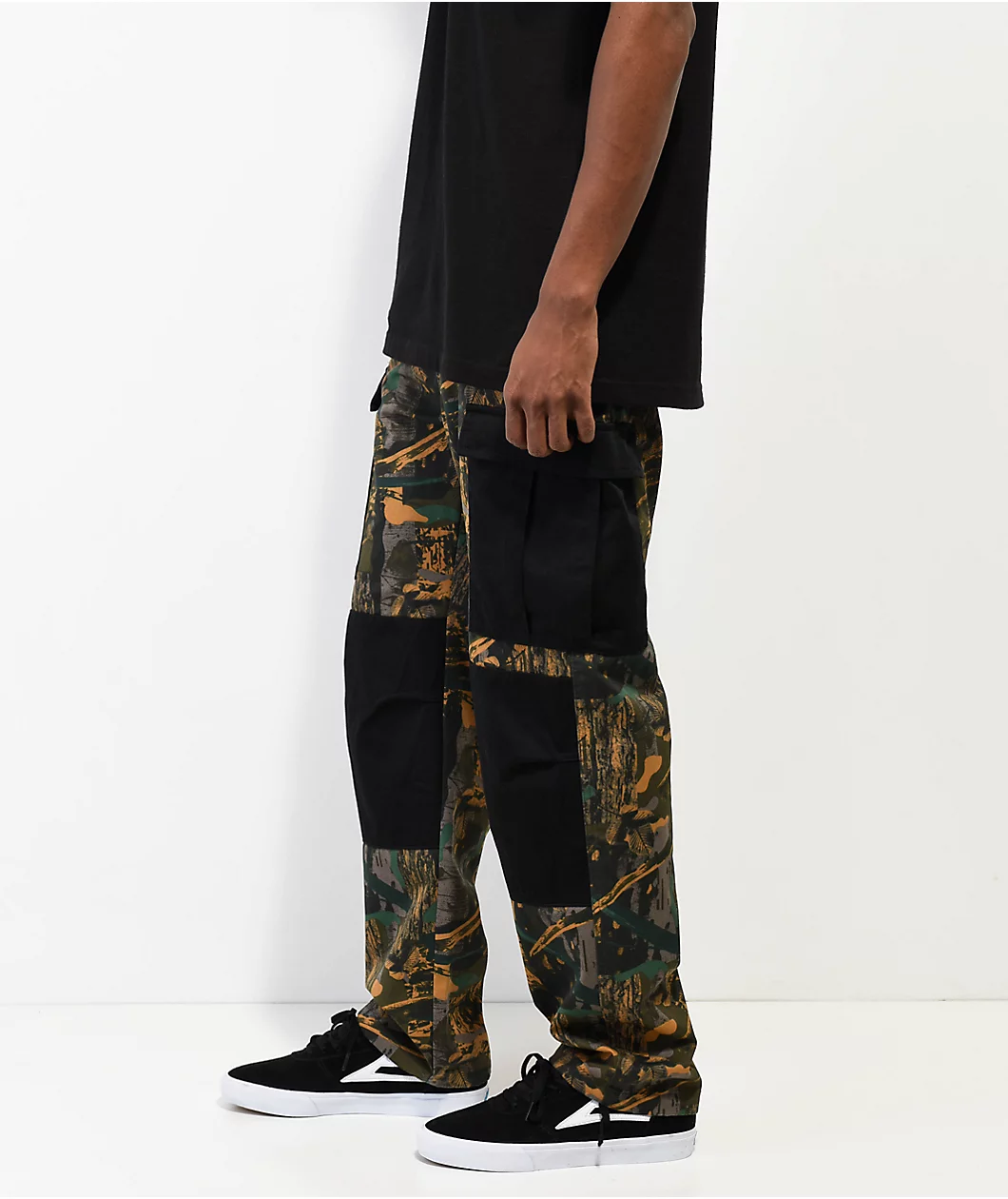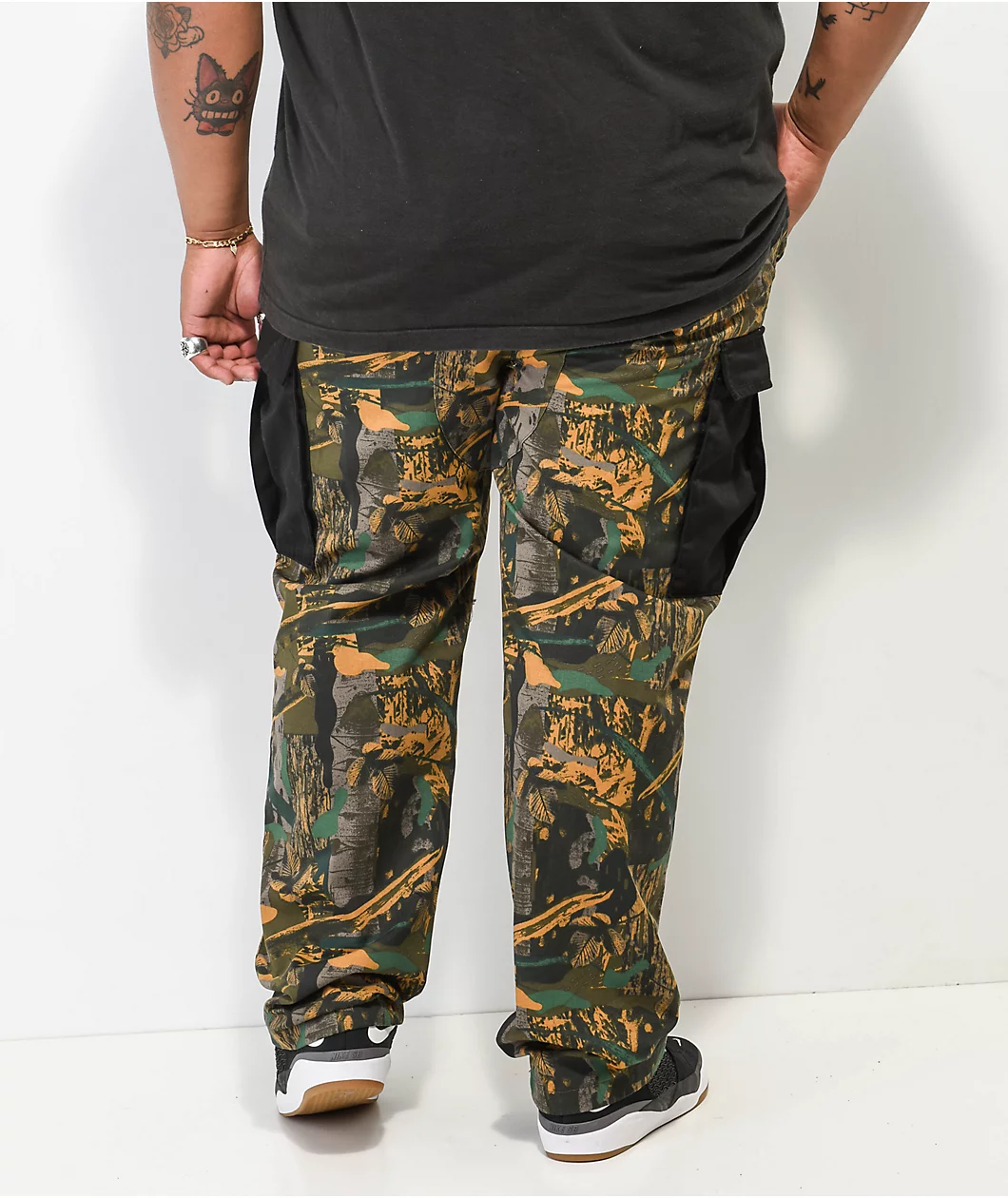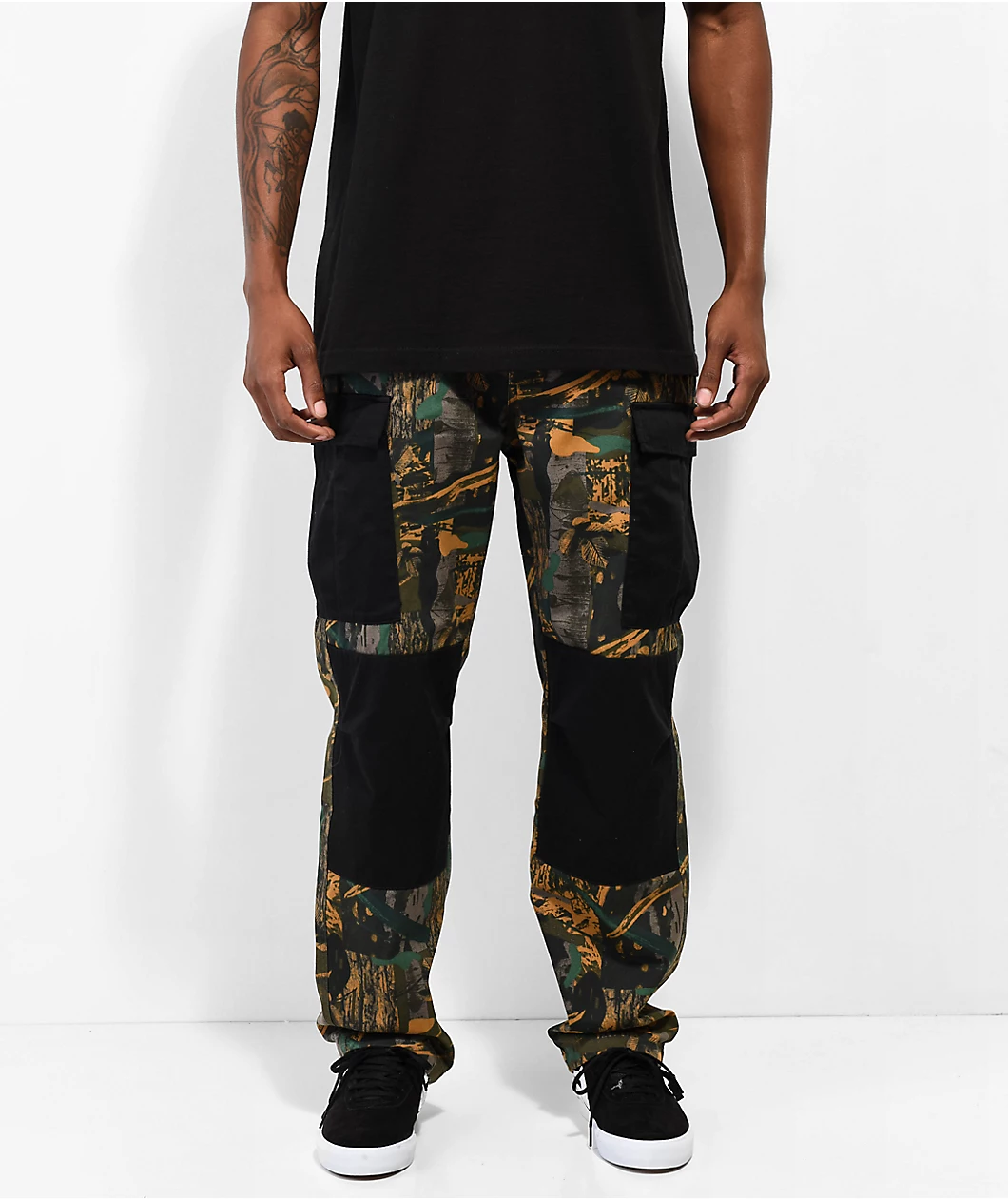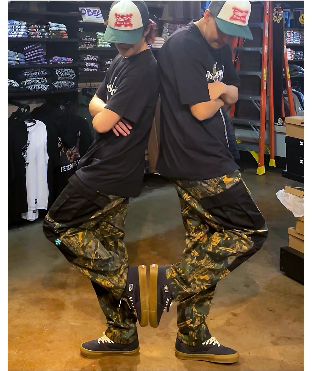 Taking inspiration from military surplus fatigues, the Stash cargo pants from Monet feature a hunter camo pattern throughout with black color block accents on the thighs and knees. Subdued green, yellow and brown tones can be seen throughout the loose-fitting skate pants, while drawstring adjustable leg openings provide the option for a cinched fit. With a classic 5-pocket cargo design and reinforced pockets flaps, the Monet skate pants are finished with a zip-fly closure, and adjustable waist tabs for a perfect fit.
