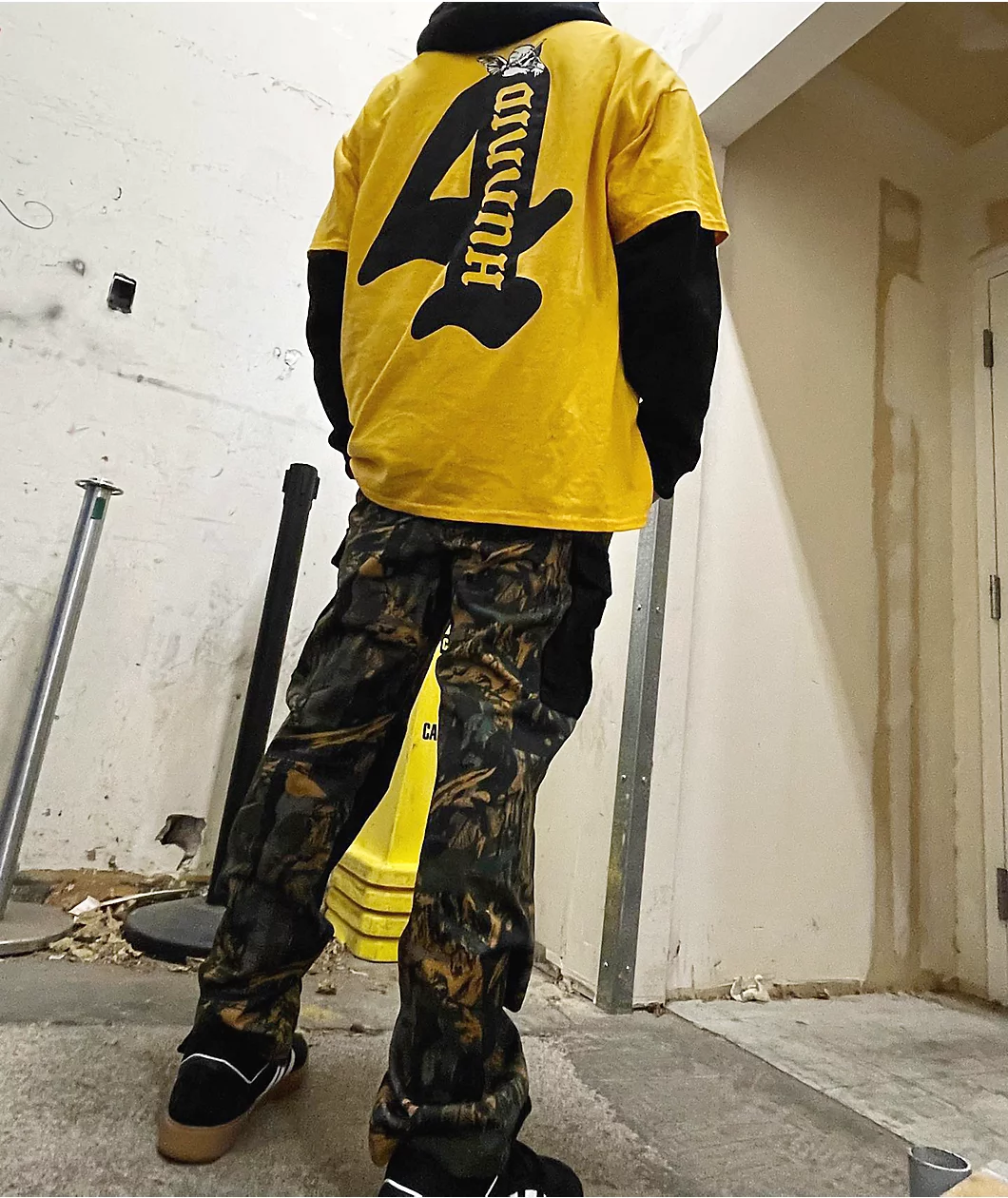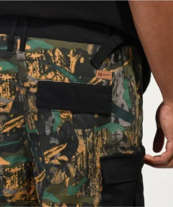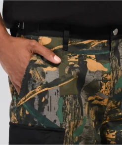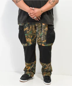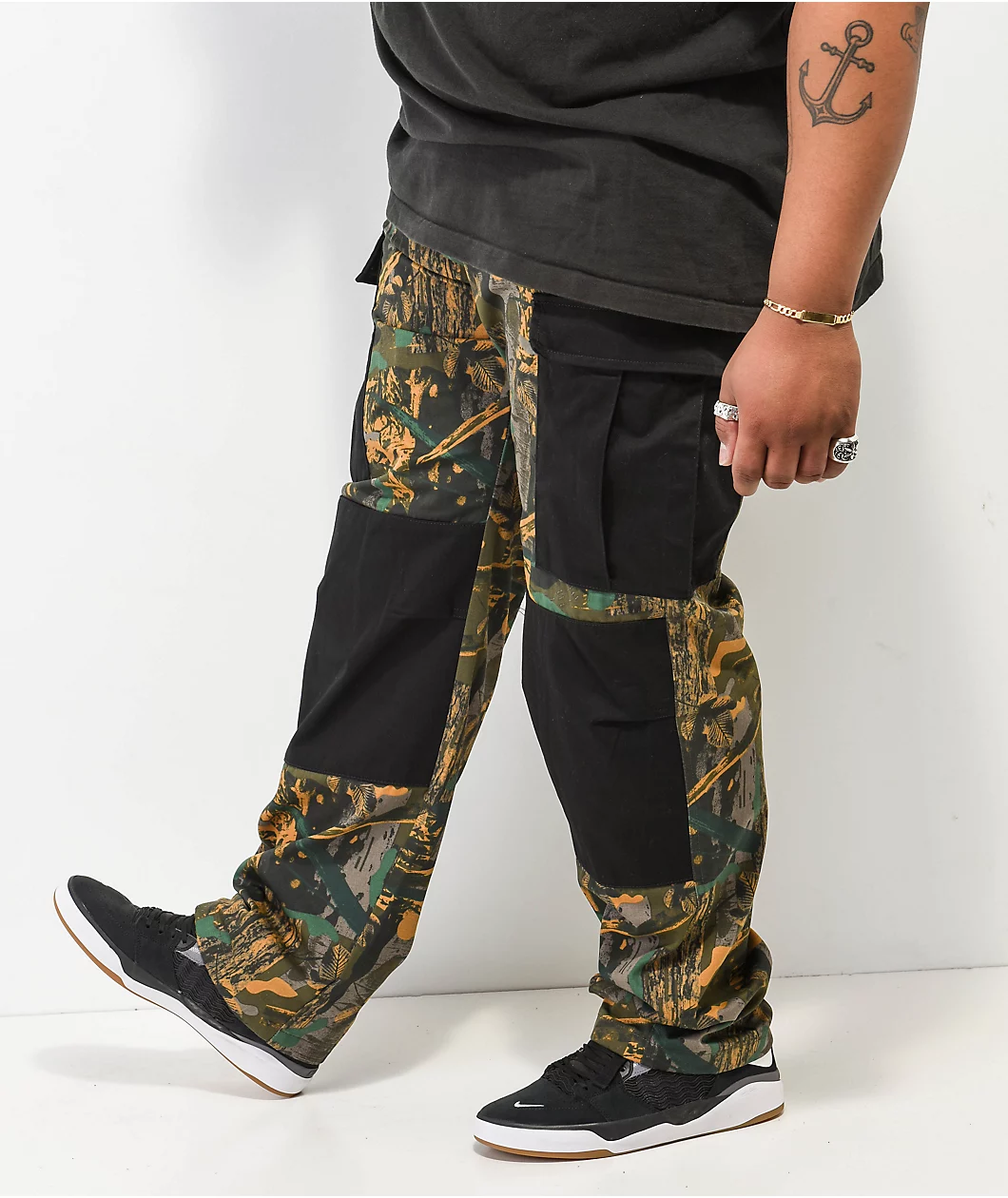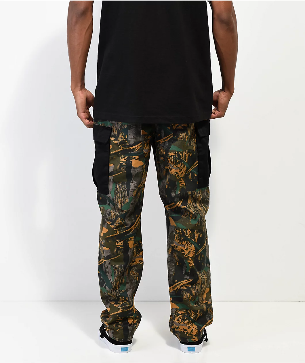 Taking inspiration from military surplus fatigues, the Stash cargo pants from Monet feature a hunter camo pattern throughout with black color block accents on the thighs and knees. Subdued green, yellow and brown tones can be seen throughout the loose-fitting skate pants, while drawstring adjustable leg openings provide the option for a cinched fit. With a classic 5-pocket cargo design and reinforced pockets flaps, the Monet skate pants are finished with a zip-fly closure, and adjustable waist tabs for a perfect fit.