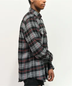 From Montage comes a plaid long-sleeved flannel that is great for dressing up or dressing down. It has a plaid pattern of black, grey and red throughout, an oxford collar, dual button chest pockets, and a classic rounded hem. It’s also made from lightweight but warm cotton that is sure to keep you comfy cozy.