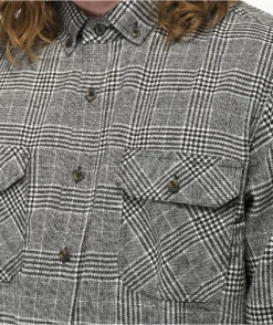 This Montage flannel shirt has a classic plaid pattern of black and white, and is made from warm but breathable cotton. This long sleeve has a full button-up closure, a turndown collar, and dual button chest pockets, as well as a slightly rounded bottom hem.