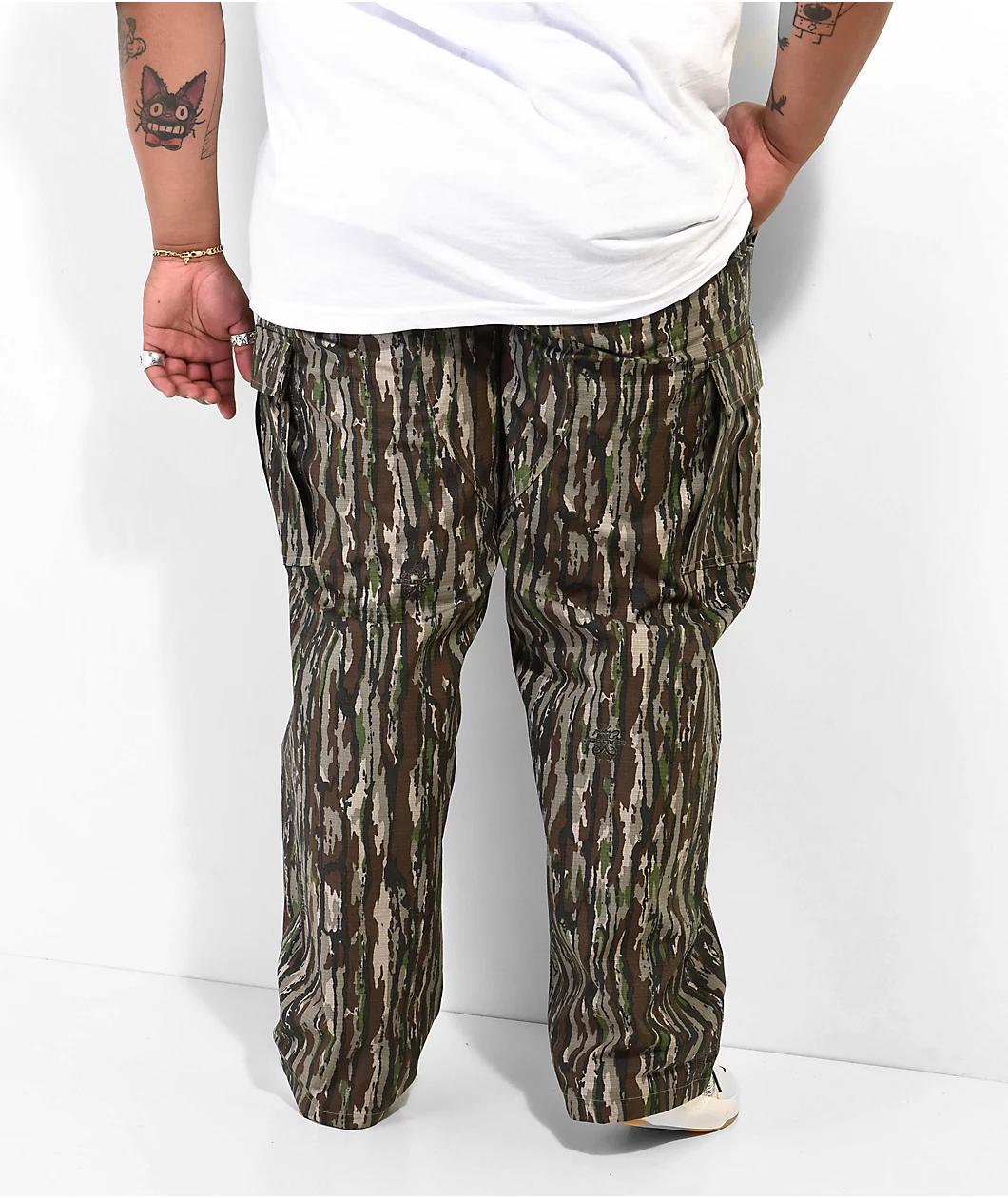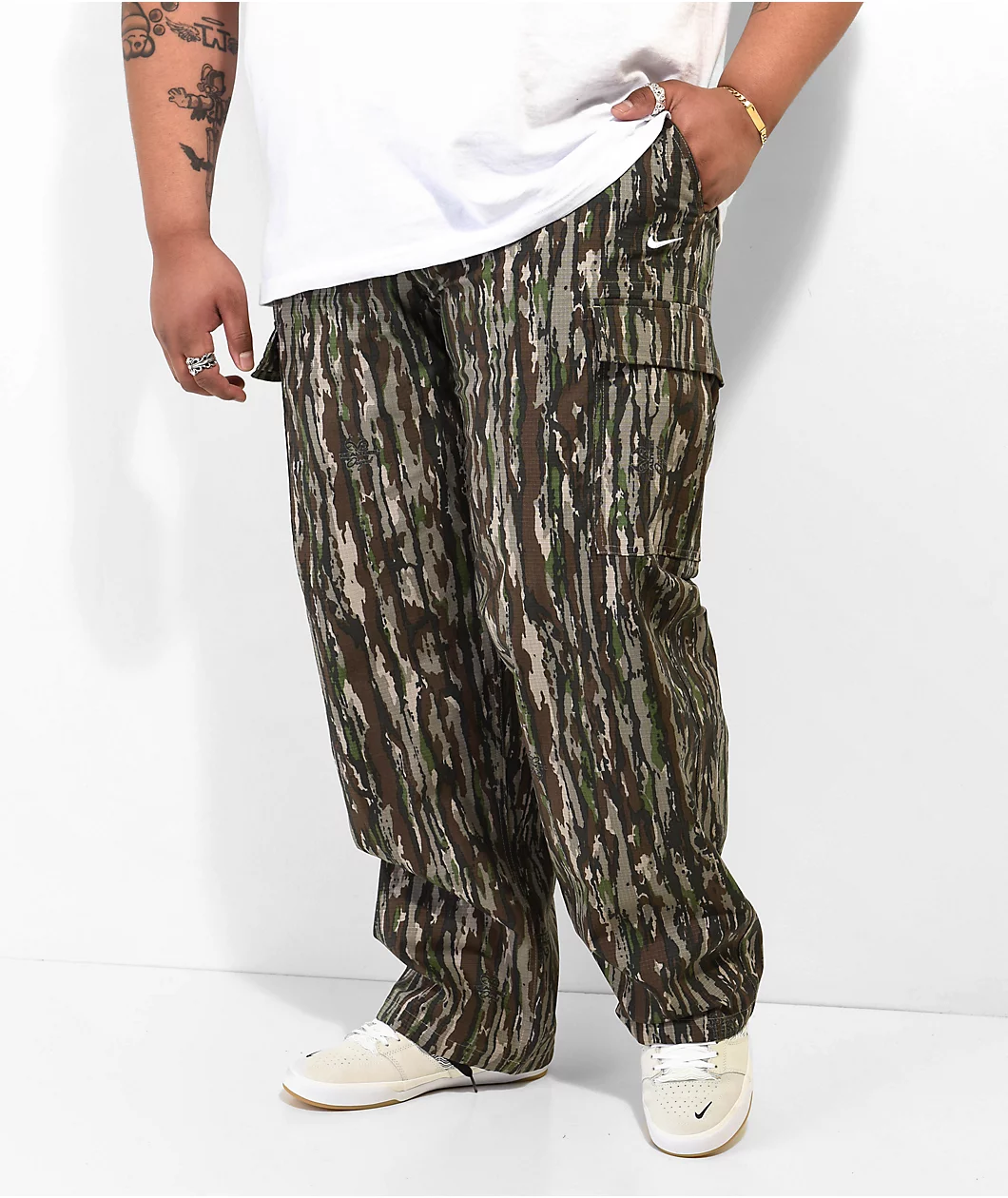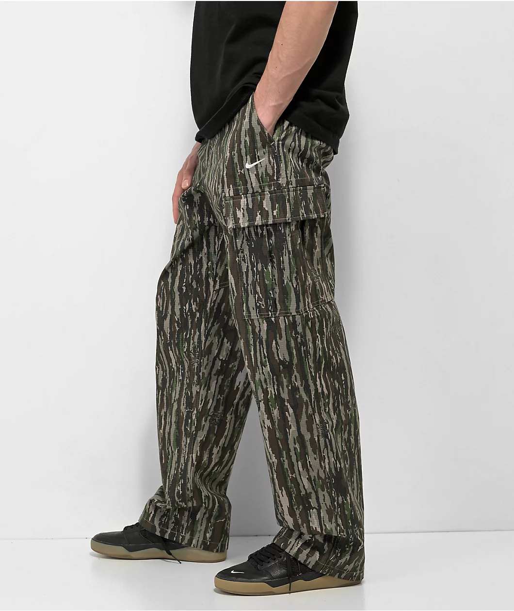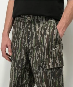 Featuring Realtree ™ camo print throughout, the Nike SB Kearny cargo pants are made using ultra-durable ripstop fabric with a variety of storage options. The stylish loose fit skate pants boast accents like an internal drawstring at the waist, reinforced stitching, and adjustable ankle openings to ensure a comfortable fit without sacrificing functionality or style.