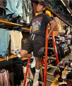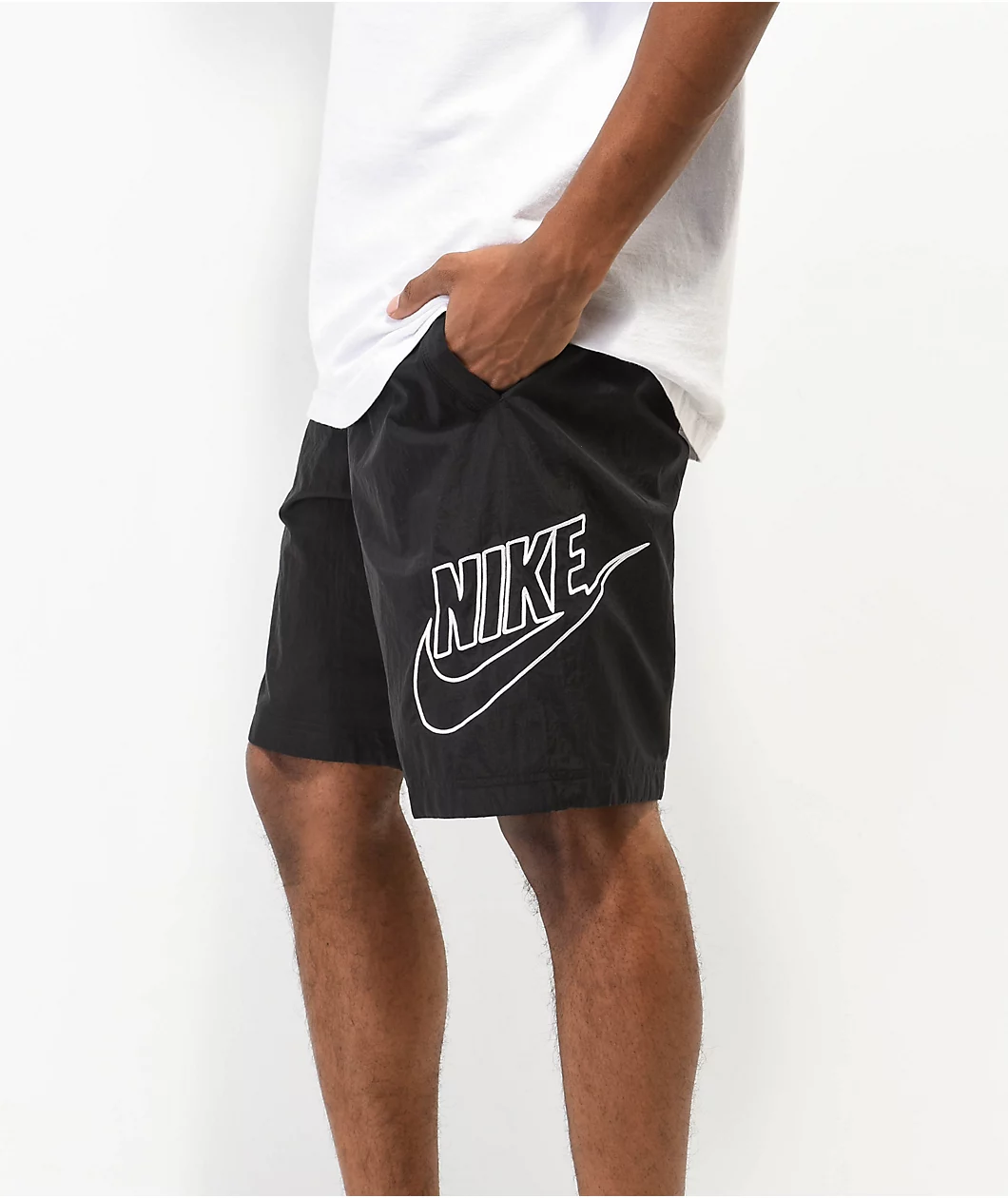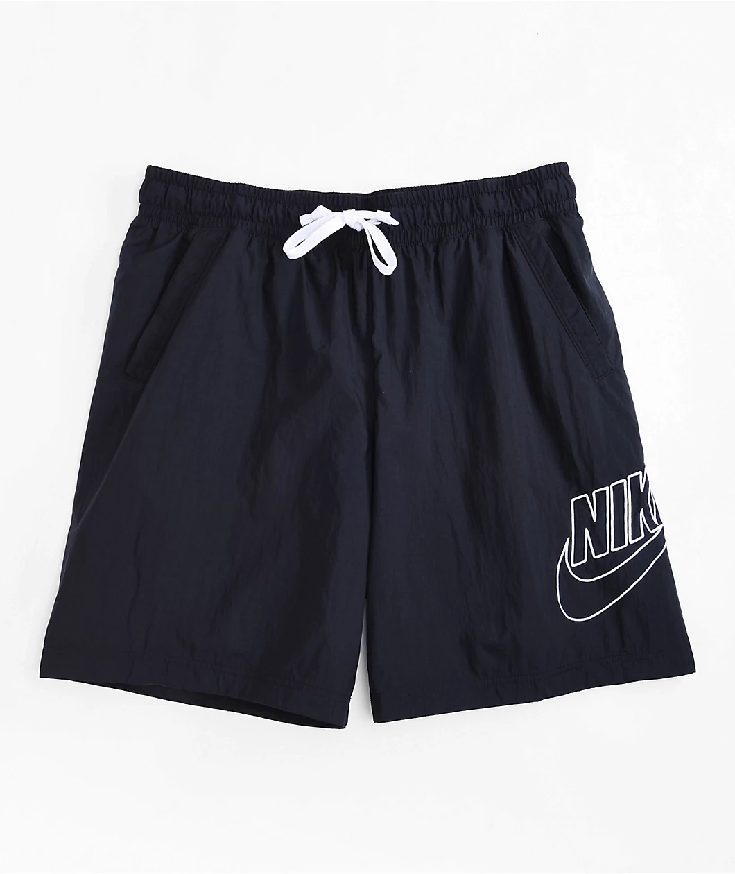 From Nike Sportswear comes the Alumni shorts in a black nylon construction, with oversize Swoosh embroidery in white situated on the left leg. The sporty yet casual design has a simple 3-pocket silhouette, while an inner mesh liner, an elastic waistband, and an exposed drawstring complete the look.