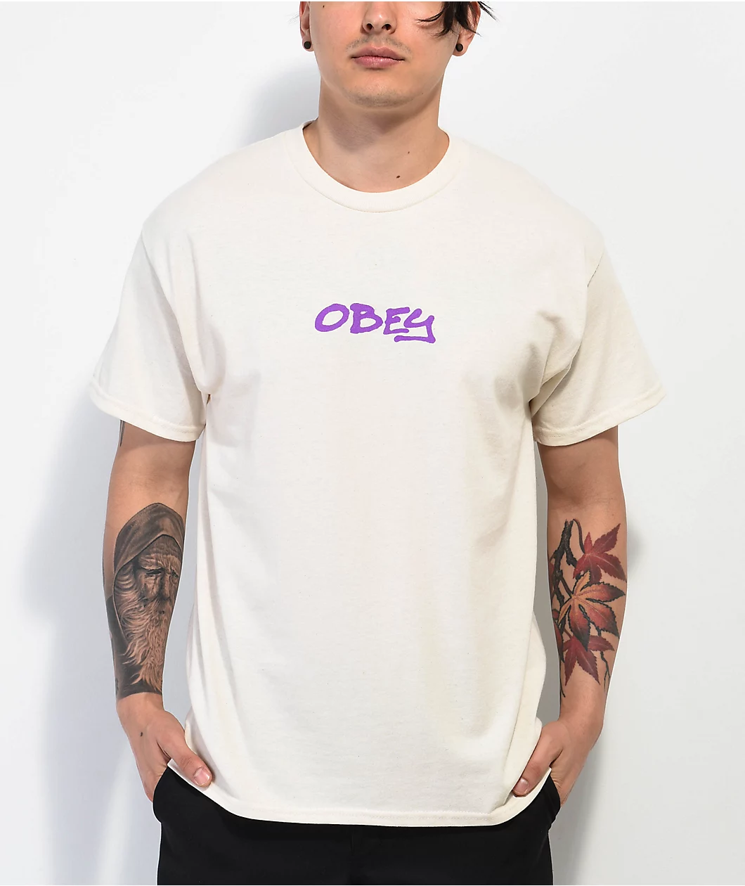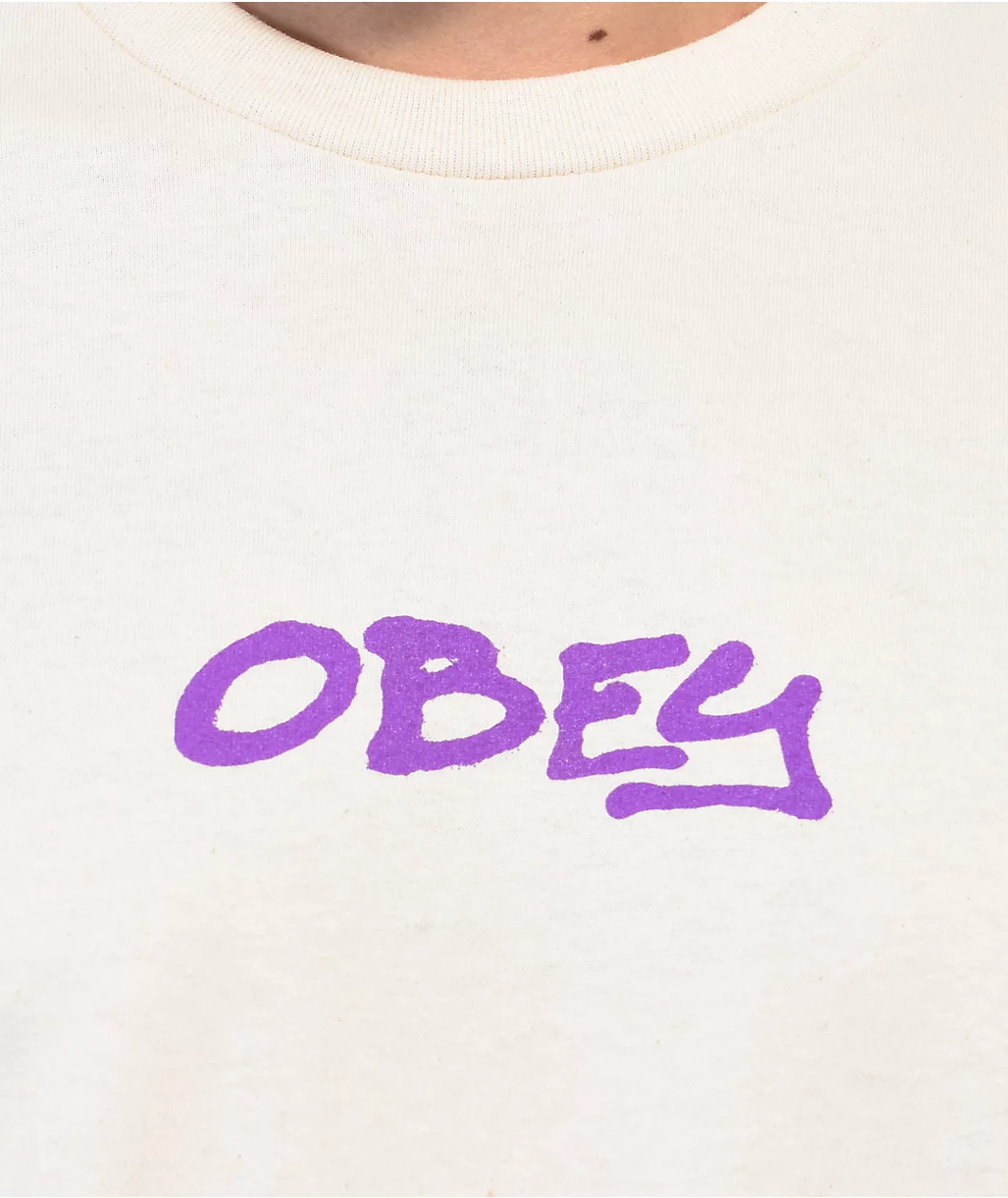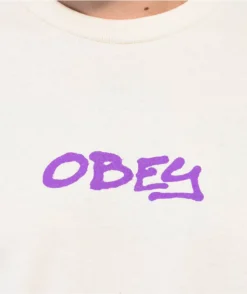 The Graffity Obey t-shirt is made of 100% cotton and comes in a natural colorway. Screen-printed Obey script on the front in a purple graffiti style while the back enlarges that text and adds type script of major cities around the world.
