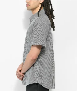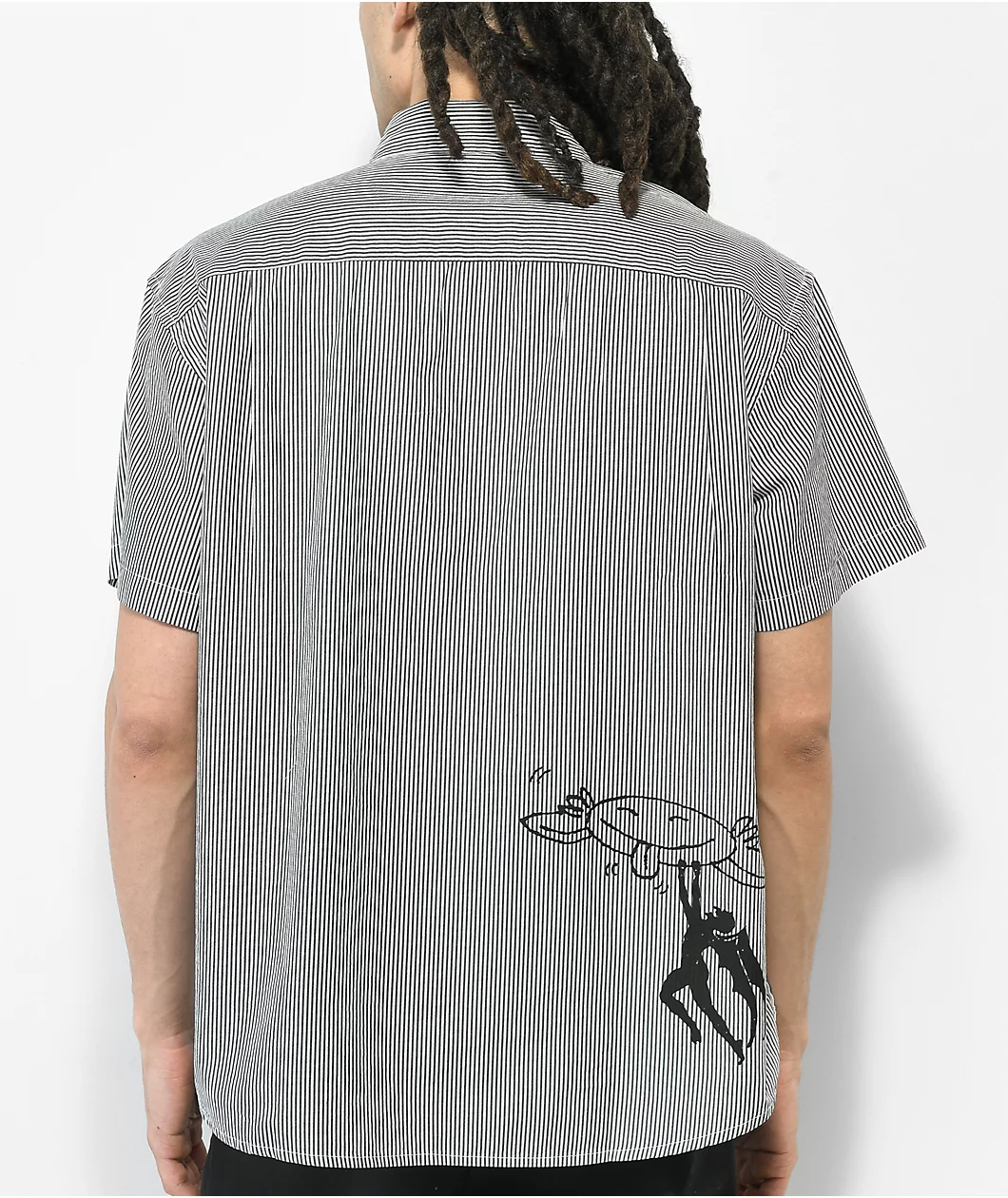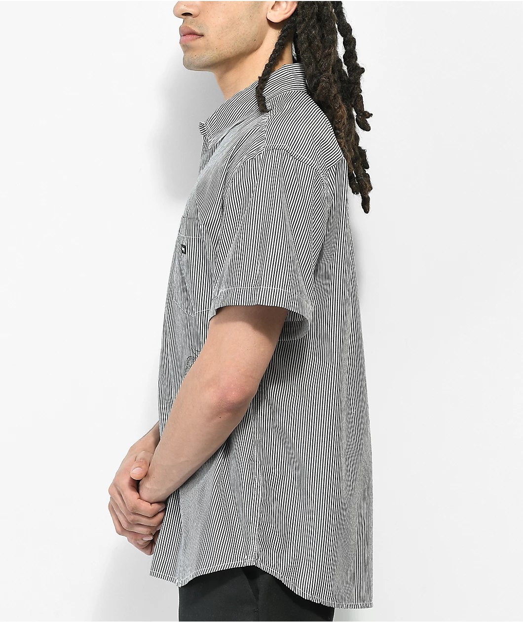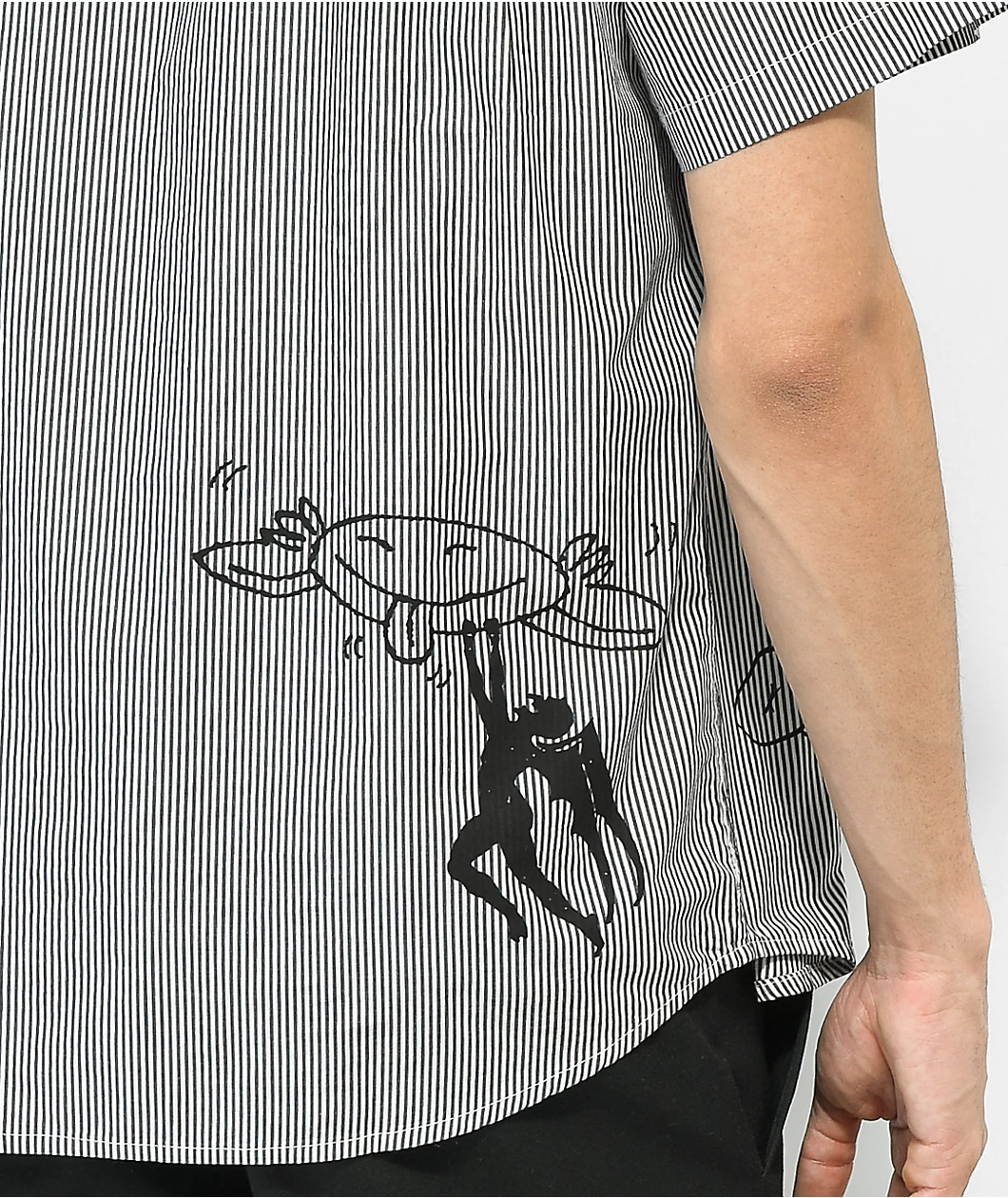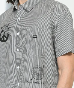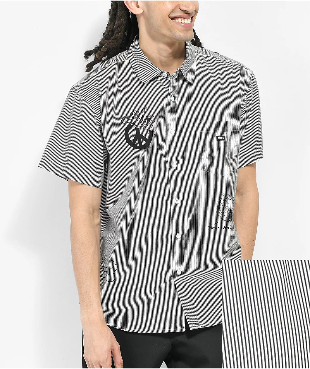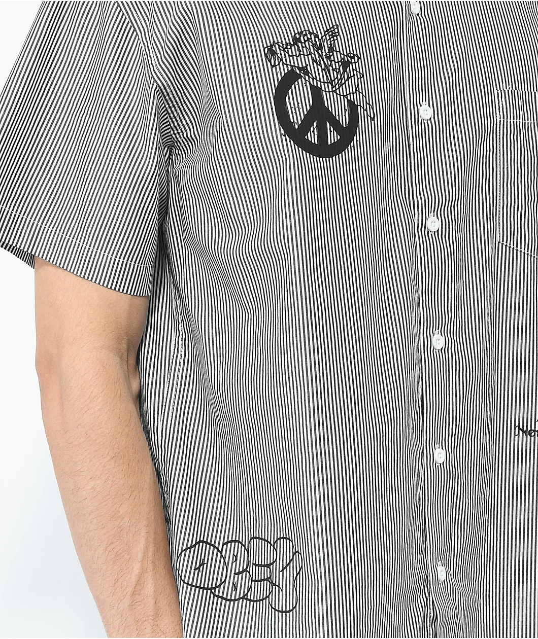 The New World Obey stripe button up shirt is made from soft, durable, lightweight organic cotton, and has a short sleeve silhouette. This casual Obey shirt has black and white pinstripes throughout and sublimated peace and cupid inspired graphics on the front and back. With its turndown collar and rounded bottom hem, this woven shirt has a classic look that is easy to pair with a variety of tops and bottoms, and great for any season.