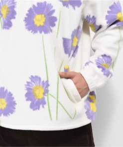 The Pollen sweatshirt from Obey is made of 100% polyester and comes in a cream tech fleece construction with a stylish mock neck and quarter zip closure. Adorning this sweatshirt are purple flowers sublimated throughout as well as a kangaroo pouch pocket on the front for easy, convenient carrying and warmth.