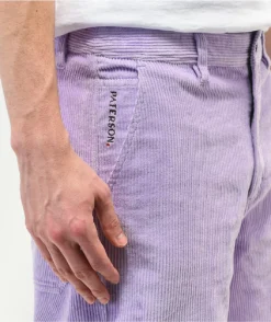 These shorts from Paterson come in a lovely lavender colorway and have a 70s-inspired corduroy construction. They have the standard 5-pocket configuration, with vertical Paterson embroidery on the right coin pocket and circular script reading “Made for play” in black on the left seat pocket.