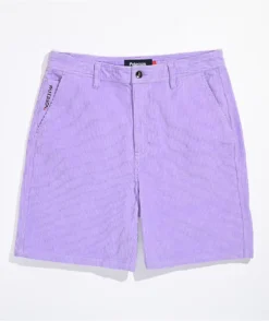 These shorts from Paterson come in a lovely lavender colorway and have a 70s-inspired corduroy construction. They have the standard 5-pocket configuration, with vertical Paterson embroidery on the right coin pocket and circular script reading “Made for play” in black on the left seat pocket.
