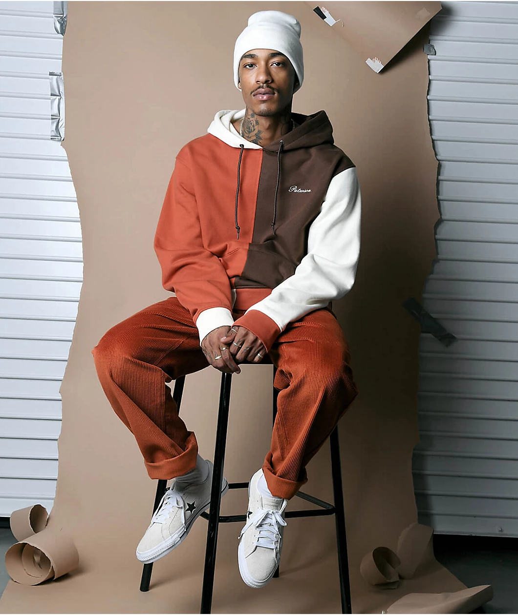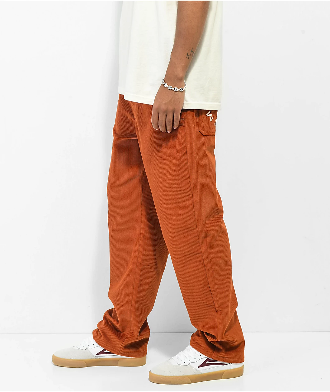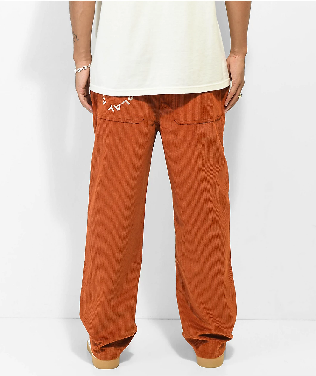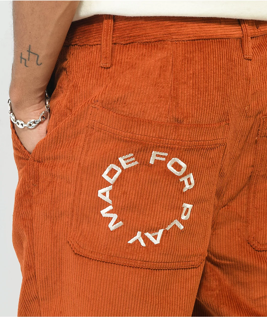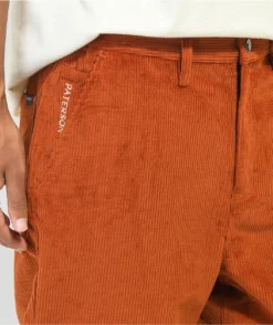 The wide leg pants from Paterson feature a rust orange, nylon corduroy construction and come in a relaxed, baggy fit. The pants have a standard 5 pocket design with front slash hand pockets and slit back seat pockets, as well as Paterson detailing throughout and white embroidered script at the back left pocket that reads “Made For Play.”