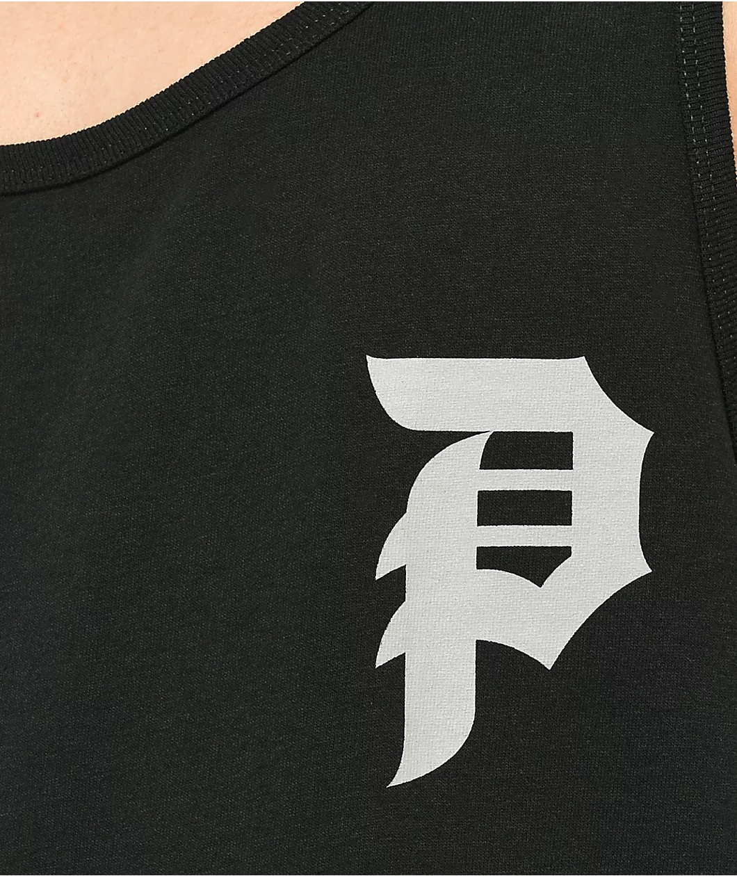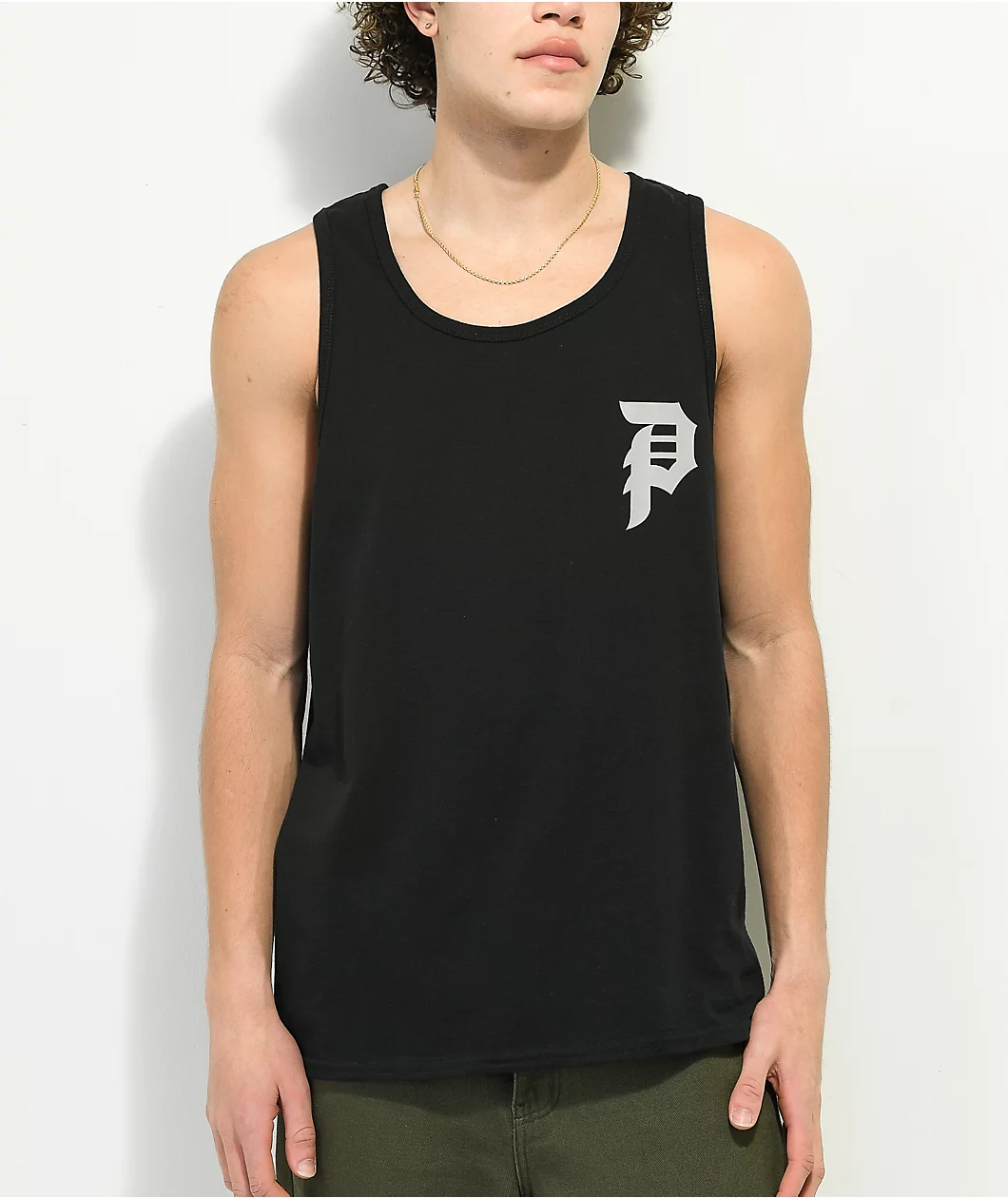 This Primitive tank top is made from soft, breathable cotton, and has a classic scoop neckline. Its black colorway is contrasted by a grey Dirty P logo screen-printed on the left of the chest and largely on the back.