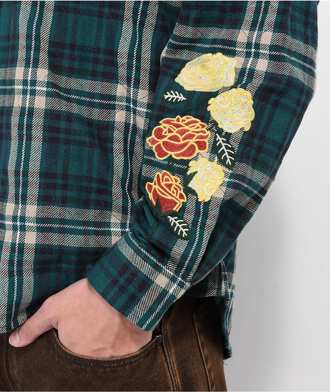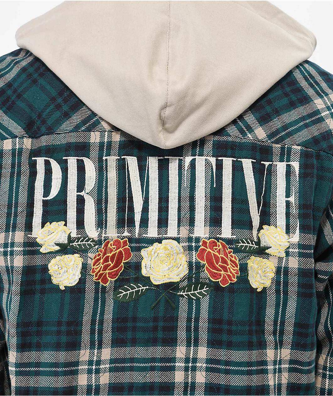 The Layne hooded flannel shirt from Primitive features a green and brown plaid pattern throughout, and embroidered floral accents along the sleeves and back. The lightweight flannel has a layered twofer construction boasting a fixed hood, and a full button up closure, dual chest pockets and primitive embroidery on the back for a fashionable, yet lightweight fall look.