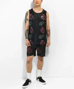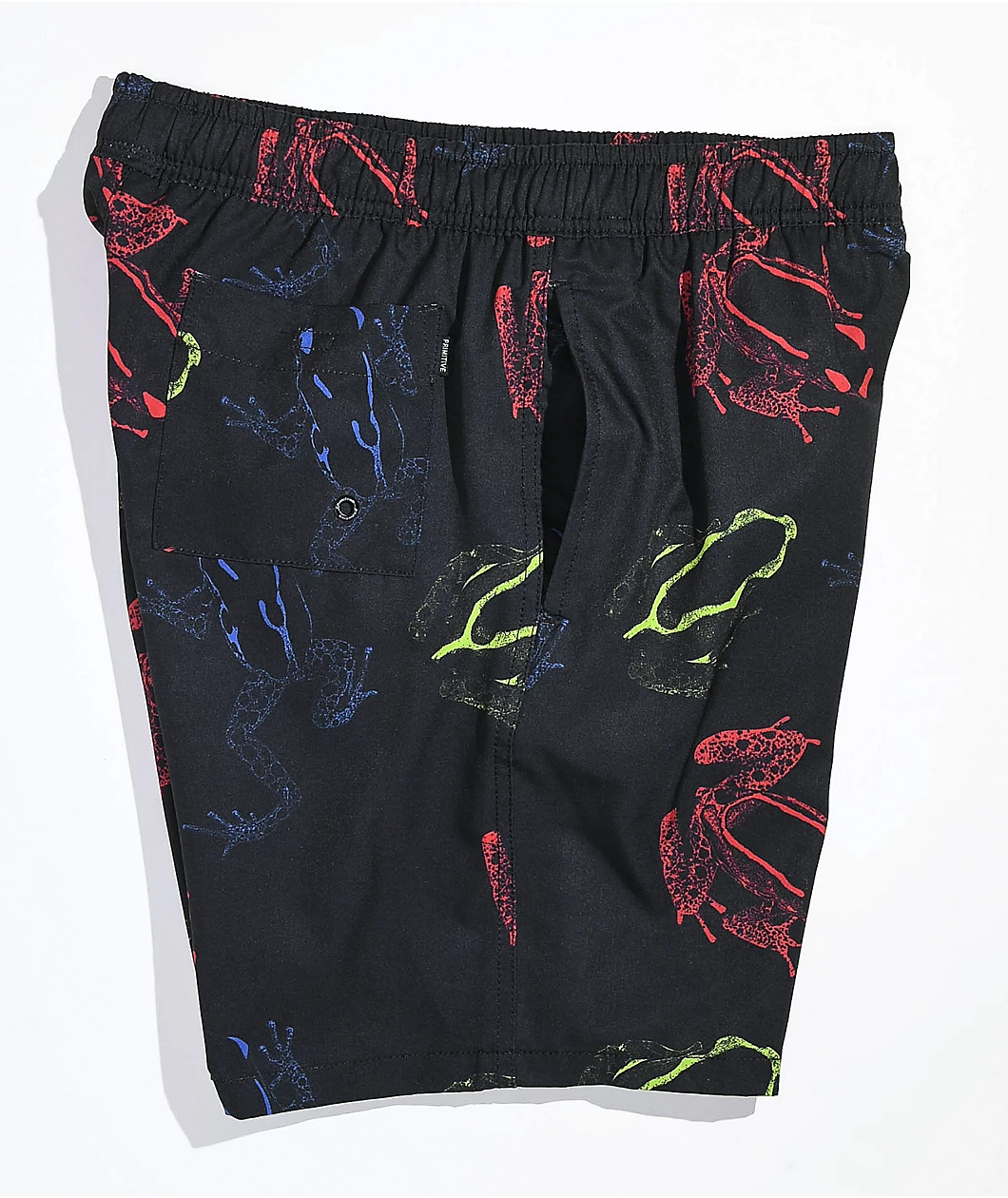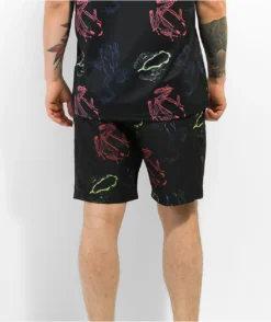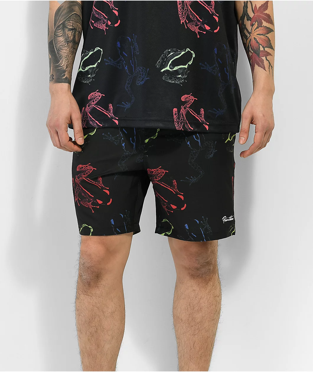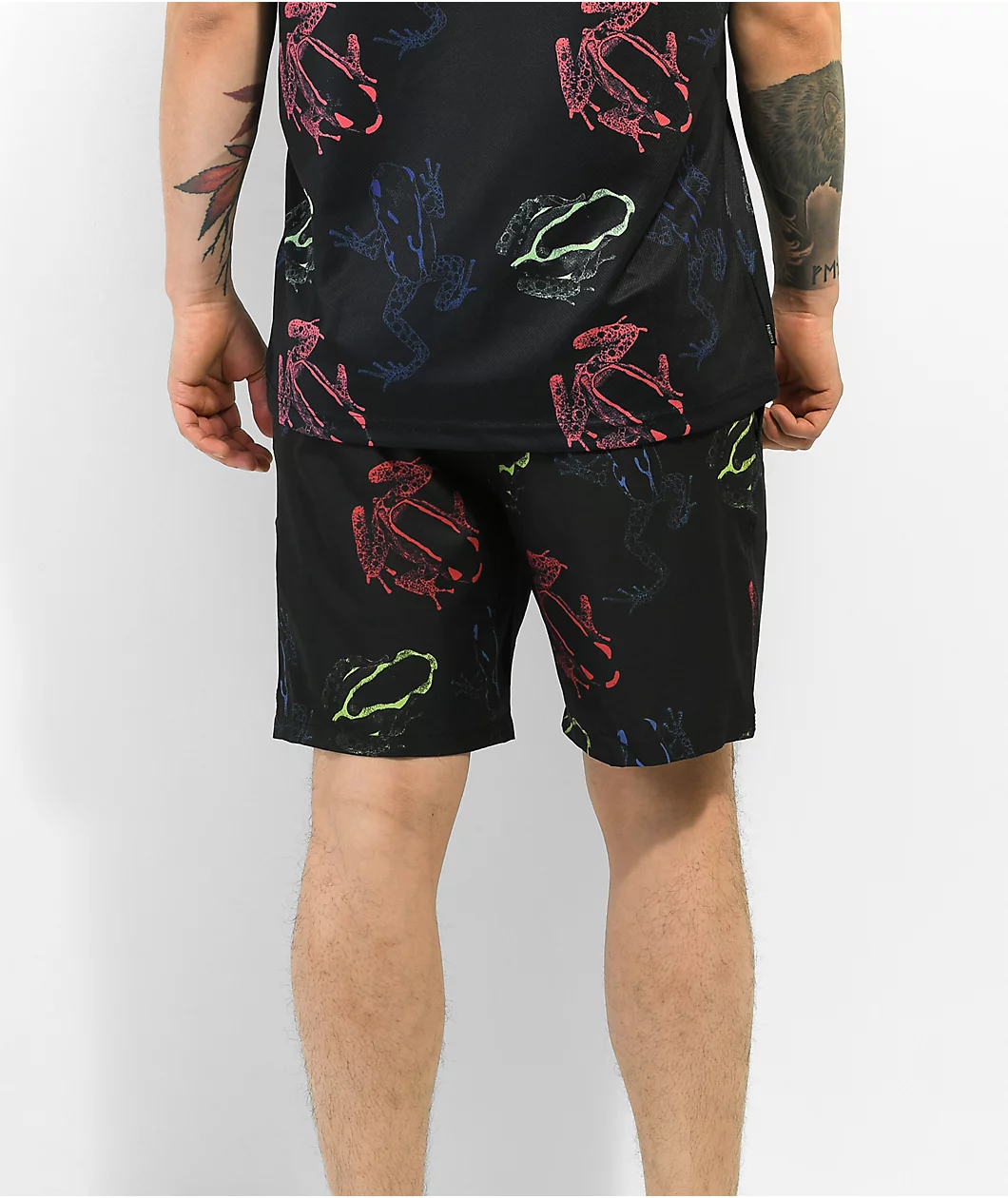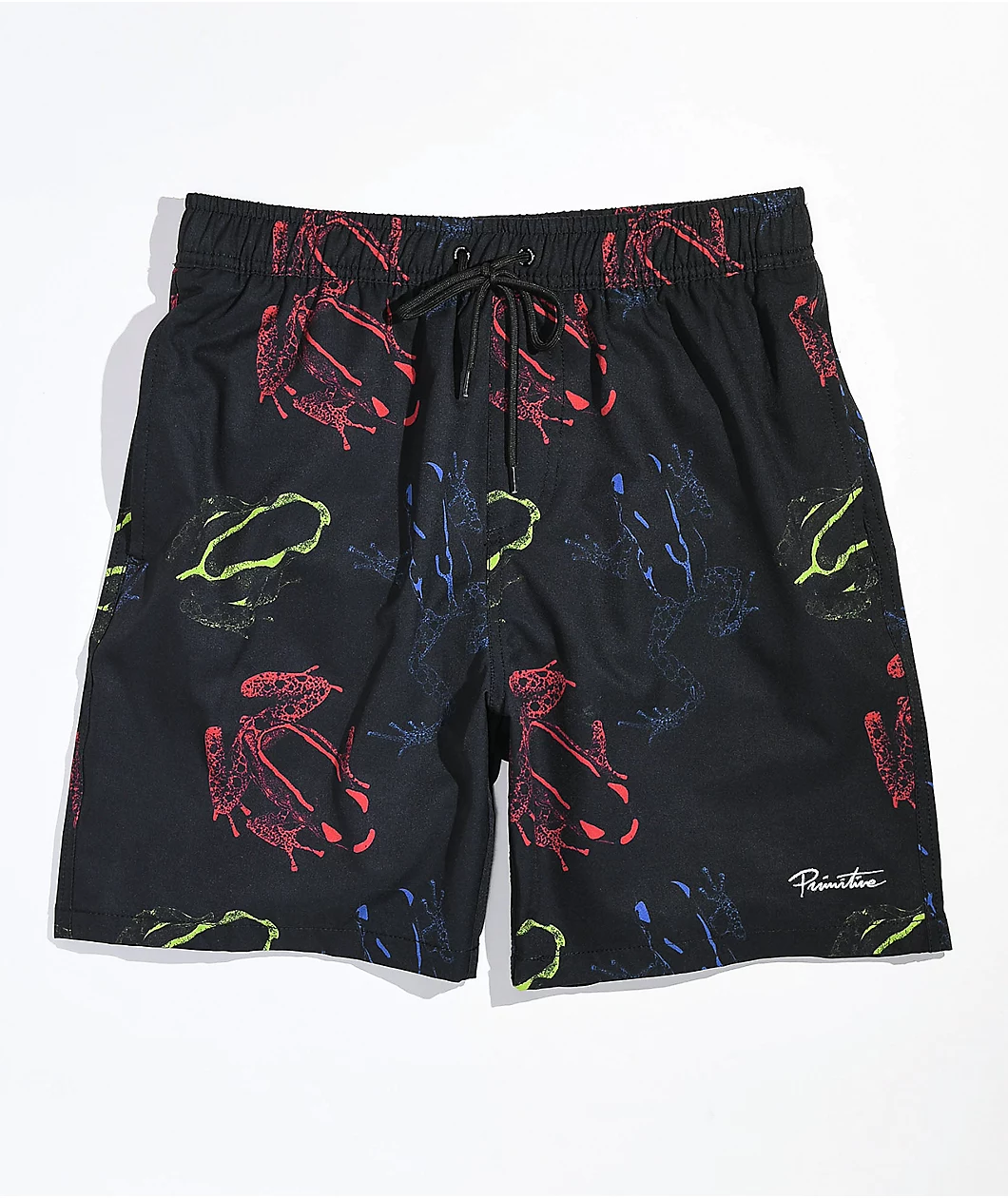From Primitive comes the Sonora boars shorts in a black colorway, featuring a trippy red, green, and blue toad pattern. The smooth polyester blend quickly wicks moisture, while the elastic waist comes with an adjustable drawstring for a secure fit. These Primitive board shorts are finished with a dual hand pockets, a back pocket with a hook and loop closure, a mesh liner, and Primitive embroidery at the left leg opening.