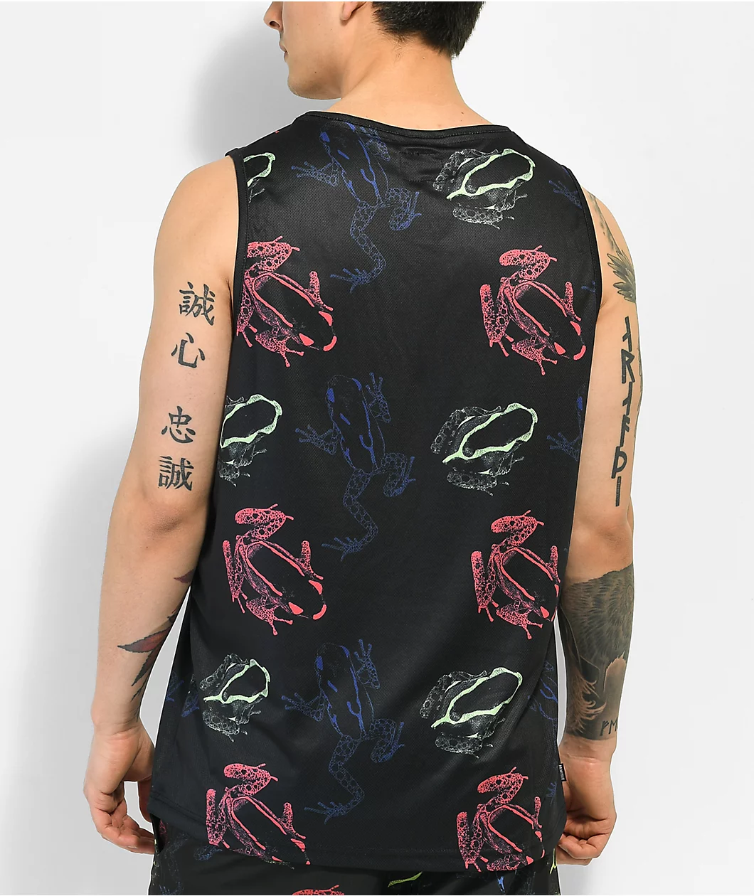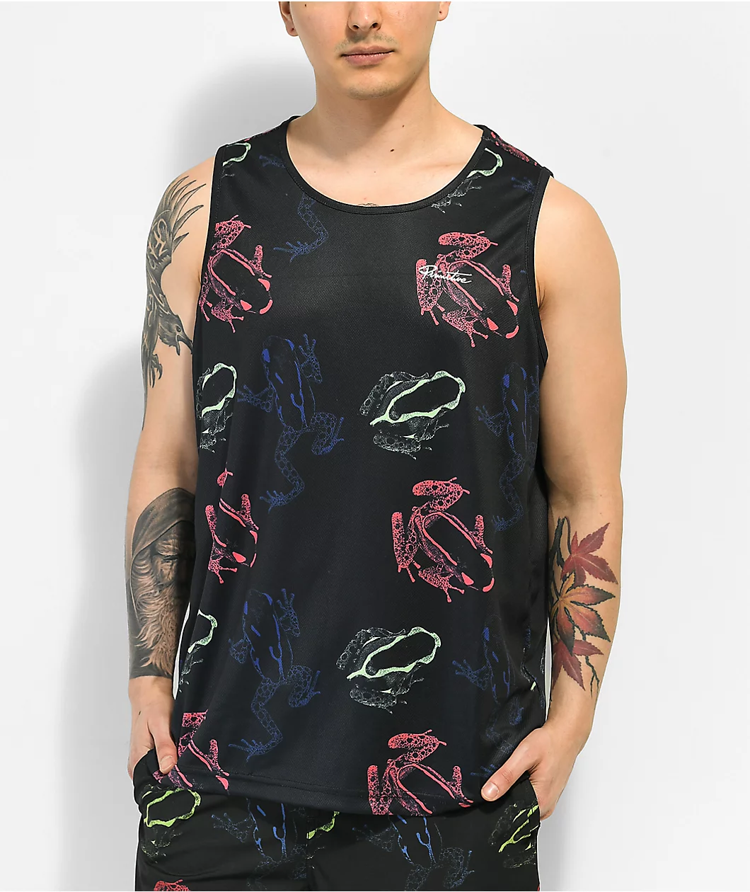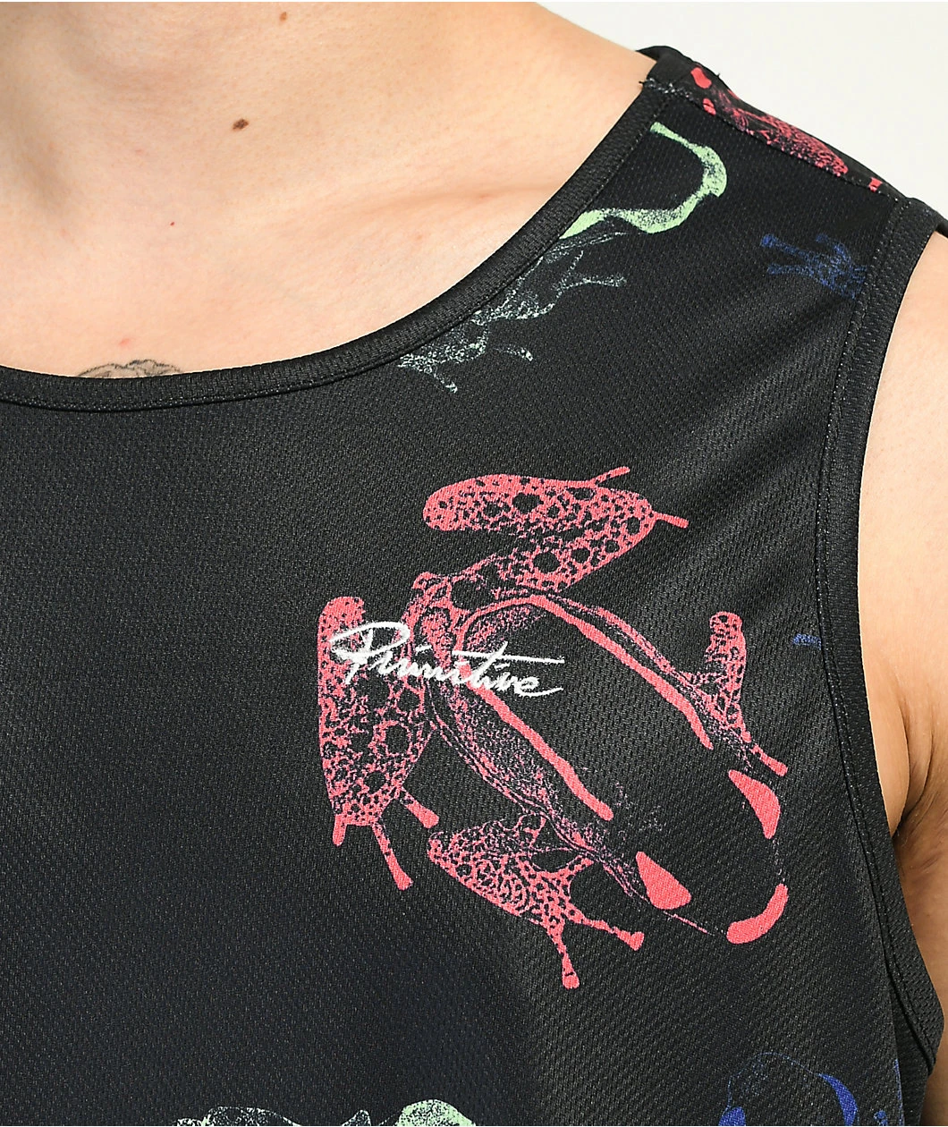 The Sonora Frog Primitive tank top is made of a breathable polyester fabrication featuring a black colorway with sublimated frog graphics throughout in pink, blue, and green, as well as the brand script embroidered on the left side of the chest for subtle branding.