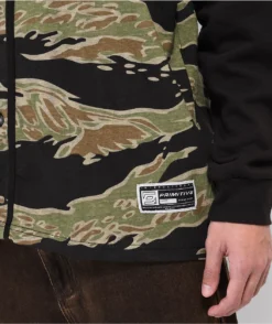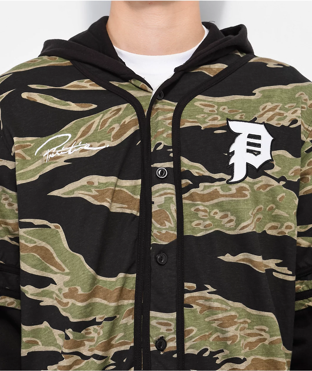 In a camo colorway comes the Tiger Two-Fer hooded baseball jersey from Primitive, displaying the well know Primitive “P” left of chest in white, Detroit style lettering for contrast. This unique jersey offers a cozy and comfy fit with sewn in sleeves and an attached hood, while a full button closure makes it easy to layer and pair with other pieces.