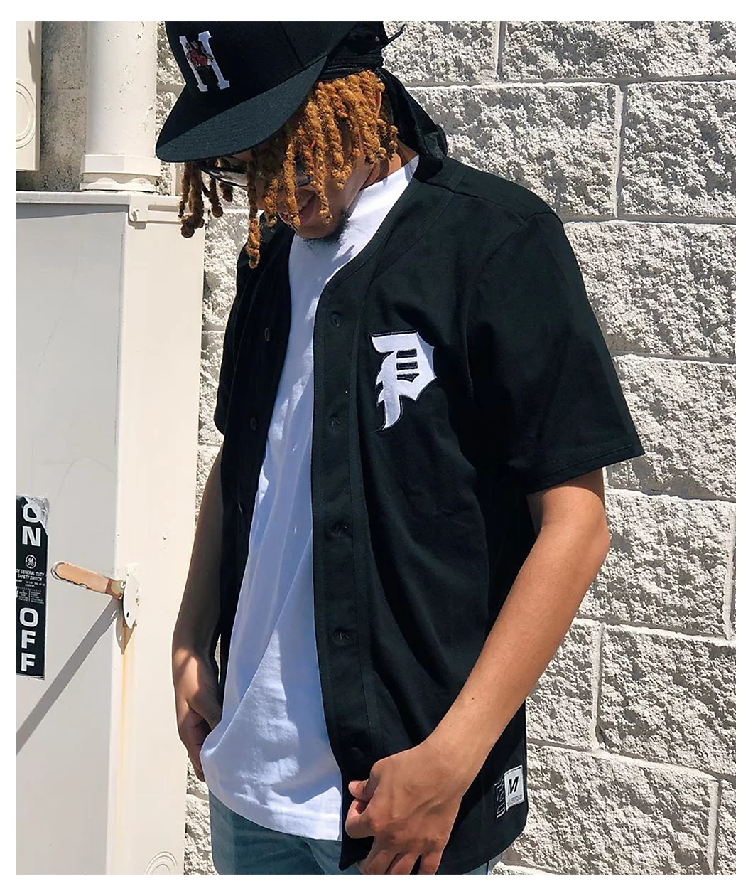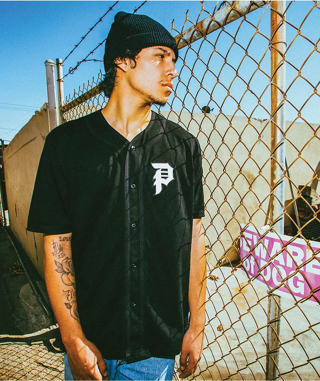 Knock your daily looks straight out of the park with the Primitive Tokyo Champion black baseball jersey. A full button-up closure and rounded bottom hemline give this jersey a classic baseball-inspired silhouette and the embroidered “P” on the left chest in white adds a bold accent of classic skate branding as well.