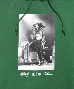 The Heartache hoodie from Primitive x Bob Marley comes in a green colorway with a screen-printed graphic of the iconic singer on the front, while the back boasts a red lion and script reading, “Trying to find peace of mind.” This sweatshirt has a classic pullover construction with a drawstring-adjustable hood and a kangaroo pouch pocket.