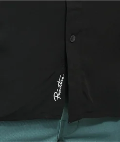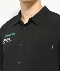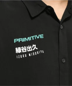The Izuku short sleeve button up shirt from Primitive x My Hero Academia comes in a black colorway with collaboration script on the right of chest and a graphic of Izuku on the back. This shirt is made of a lightweight, breathable rayon with full button closure and a turndown collar for a classy look.
