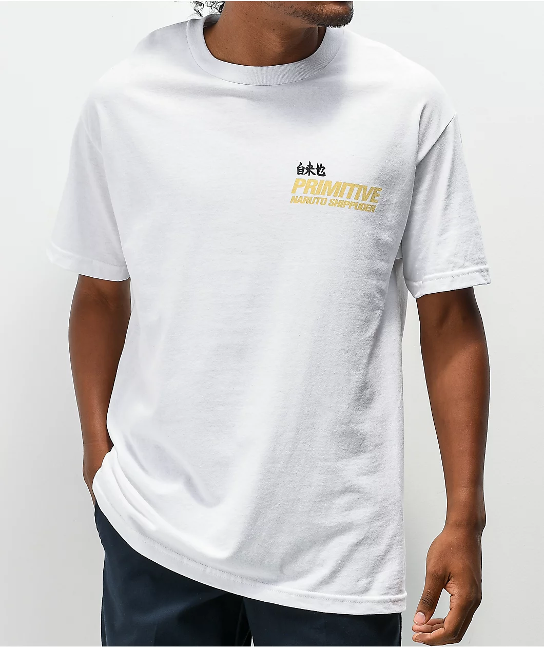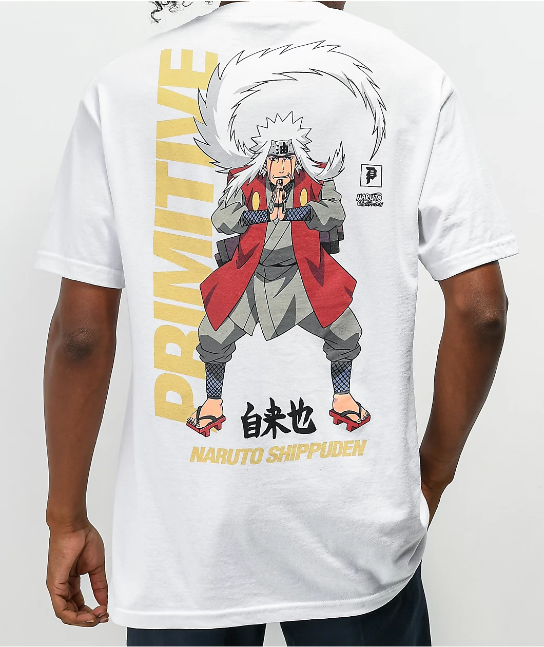 Add a cartoony creation to your favorite ‘fit with the Jiraiya white t-shirt from Primitive x Naruto Shippuden! Primitive x Naruto Shippuden script appears across the chest, while the back sports a large graphic of Jiraiya, posing in a warrior’s stance, giving tons of warrior energy into any fresh ‘fit.