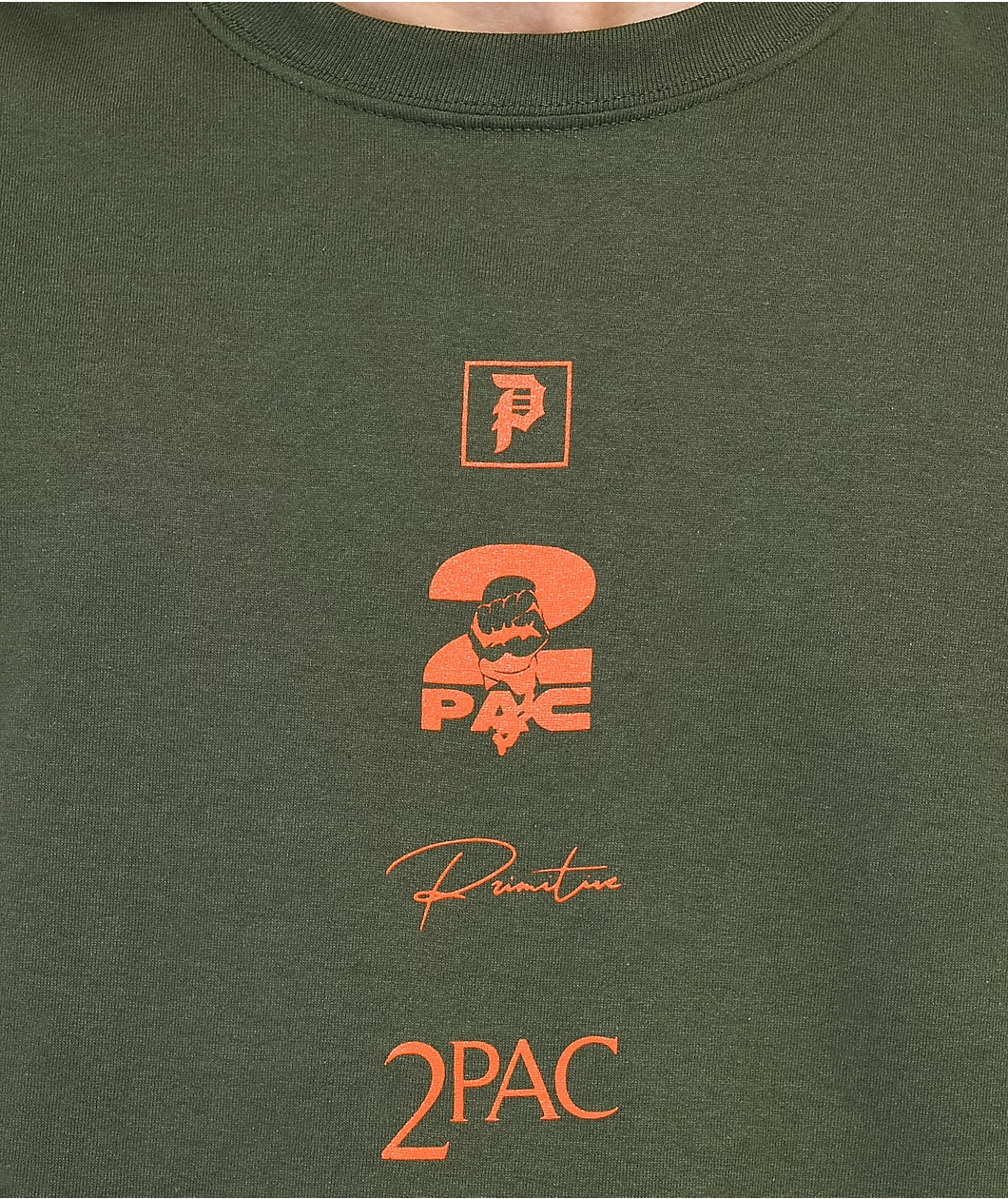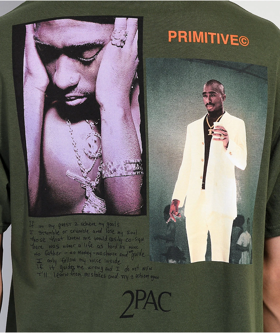 From the Primitive Skateboards and Tupac collab comes the Voice short sleeve t-shirt. This Primitive shirt comes in an army green colorway with screen-printed collaborative logos on the front and, on the back, images of Tupac and the lyrics to “If I Fail.”