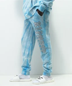 With the brand name in rhinestones down the right leg, The Sent From Heaven tie dye sweatpants from RIPNDIP come in a light blue colorway with a soft, fleece lining inside for maximum comfort and style.