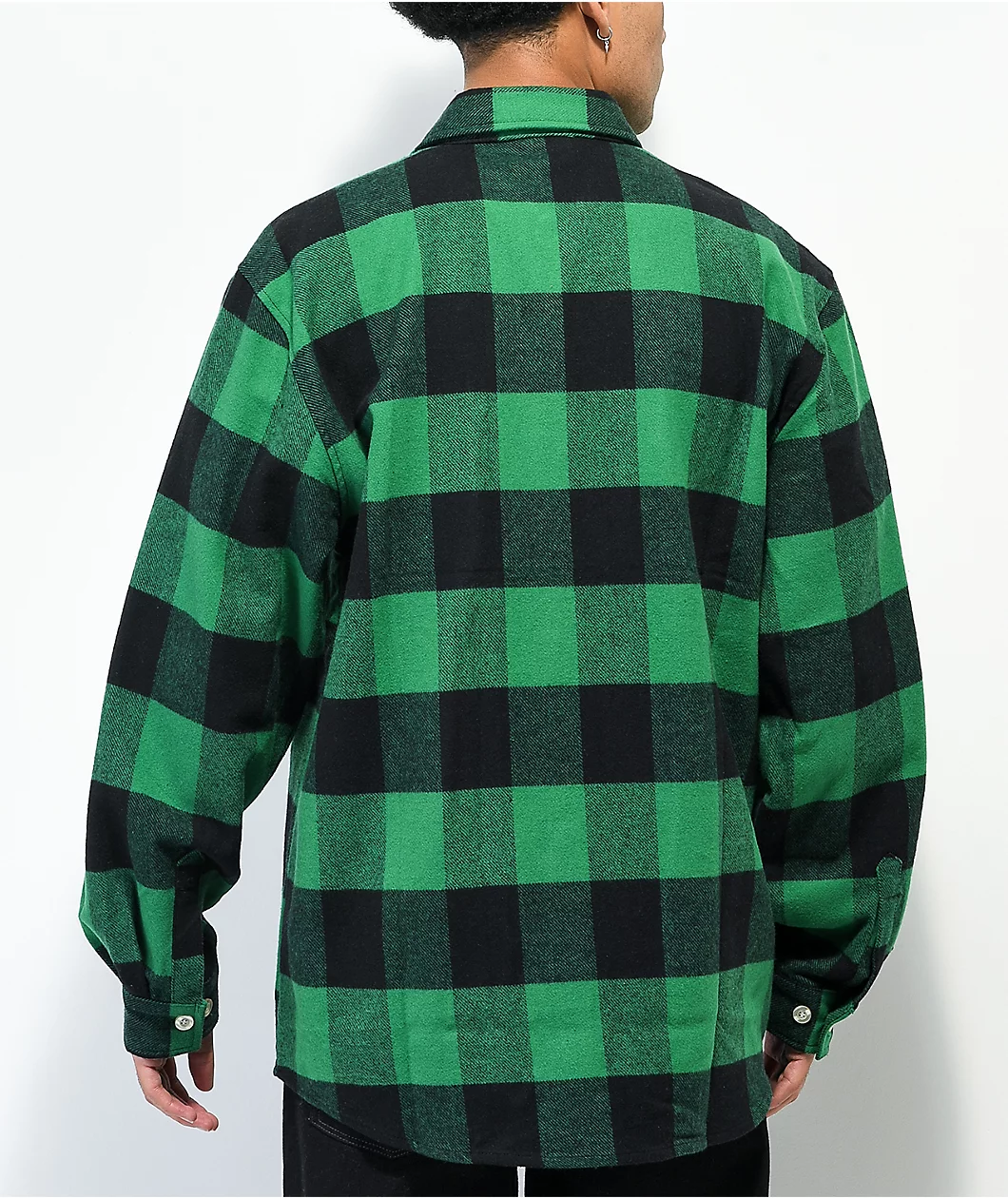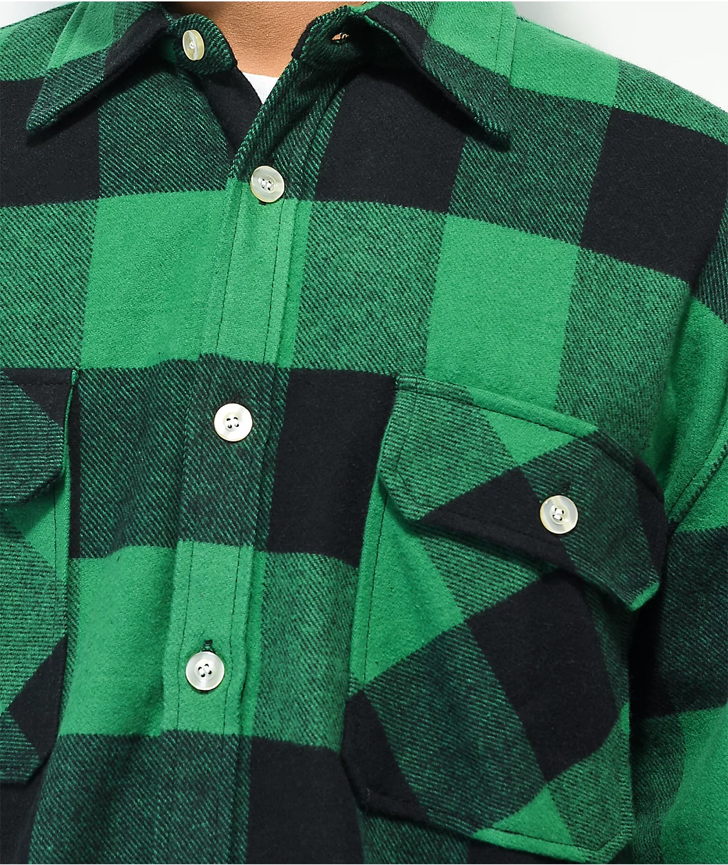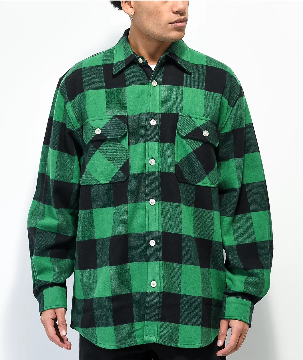 The Rothco Heavy flannel shirt has a wide green and black plaid pattern and a thick cotton construction. With its full button-up closure and boxier fit, this Rothco shacket is great layered or worn on its own, and because of its extra heavyweight construction, it’ll keep you warm and comfortable.