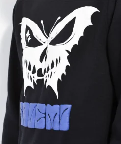 The Butterfly crewneck sweatshirt from Salem7 is made of a soft cotton-poly blend and comes in a black colorway with a white butterfly screen-printed on the front, above puffy indigo script for bold branding.