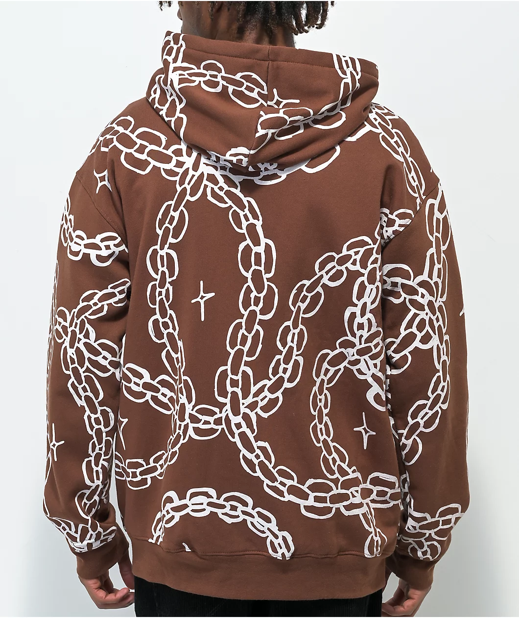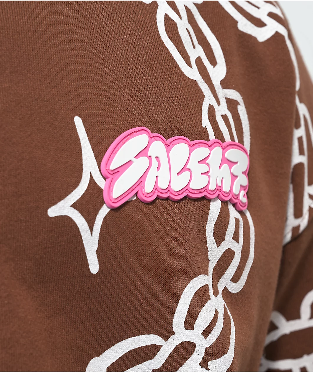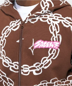 The Chains zip hoodie from Salem7 is made from a soft, midweight, warm cotton-poly blend, and has a white, all-over print of chains against a brown colorway, with a rubber brand patch on the left of the chest.