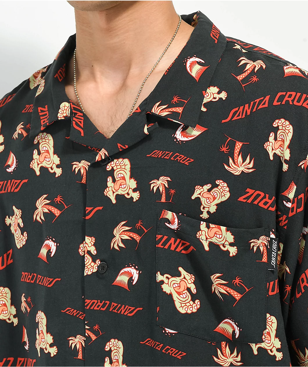 The Beach Bum Hand short sleeve button up shirt from Santa Cruz comes in a black colorway, with sublimated images of palm trees, screaming hands, waves, and red Santa Cruz branding throughout. Fabricated using extra soft rayon, the breathable shirt has a loose fit, and is complete with a left chest pocket, a slightly curved hemline, and a camp collar.