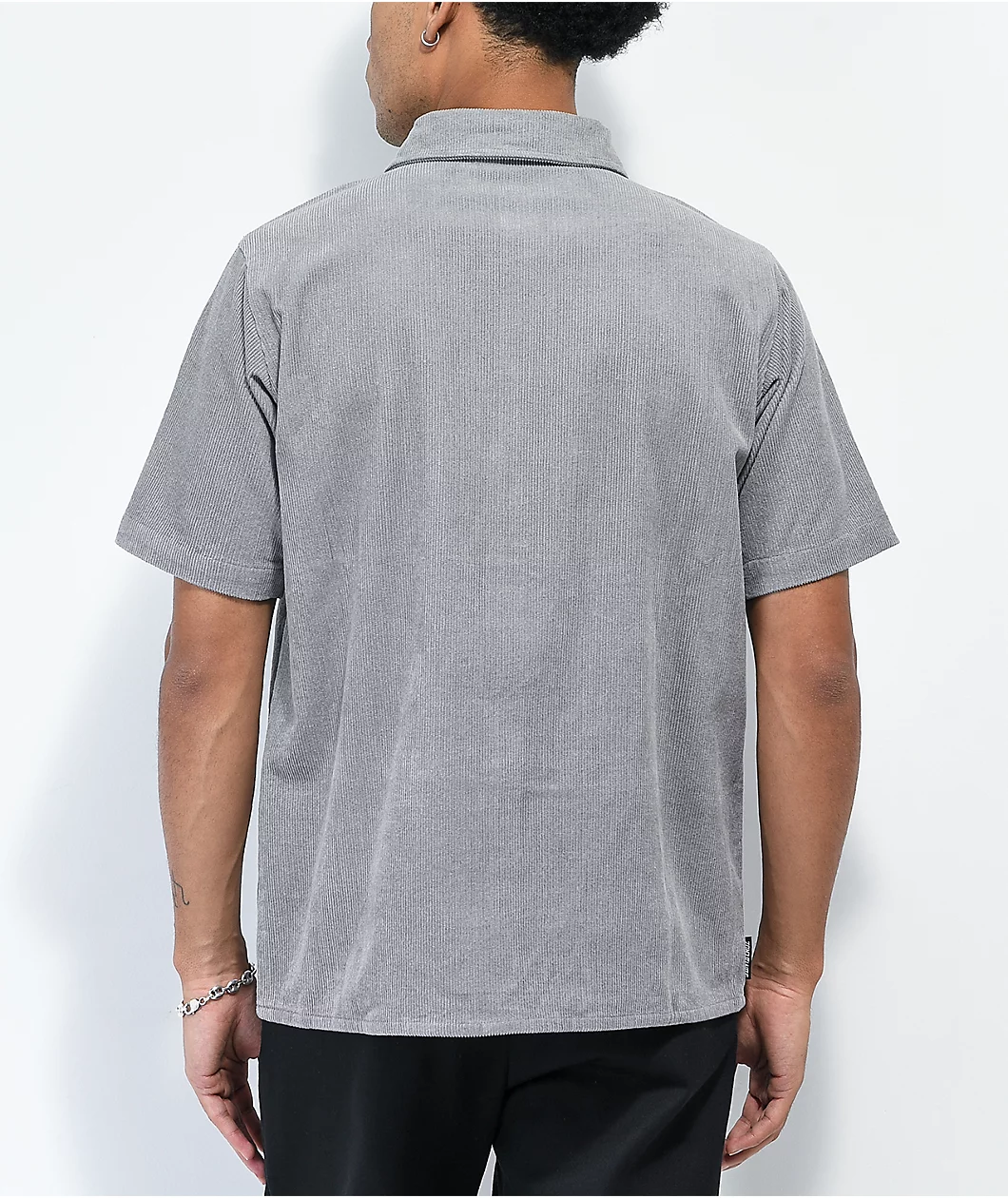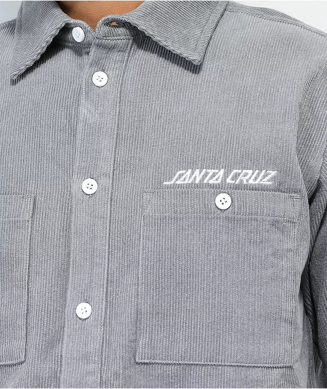 This Santa Cruz shirt comes in a grey colorway made of a 100% cotton, corduroy construction with short sleeves and full button-up closure. This shirt features dual chest patch pockets with the brand name embroidered above the left pocket in white as well as a brand tag on the lower right side.