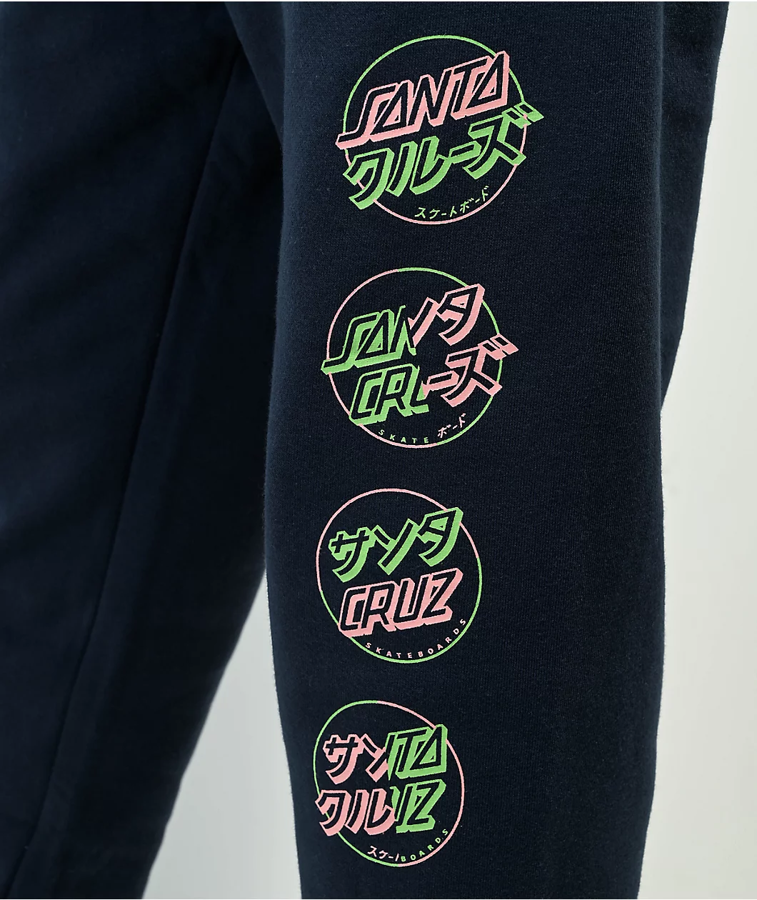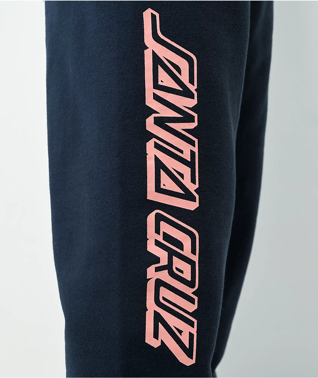 The Outline Stripe sweatpants from Santa Cruz come in a navy colorway with the brand’s Japanese logo printed down the left leg and peach brand script down the right. These comfy pants are made of a soft cotton-poly blend with a drawstring-adjustable waistband and tapered legs for a secure fit.