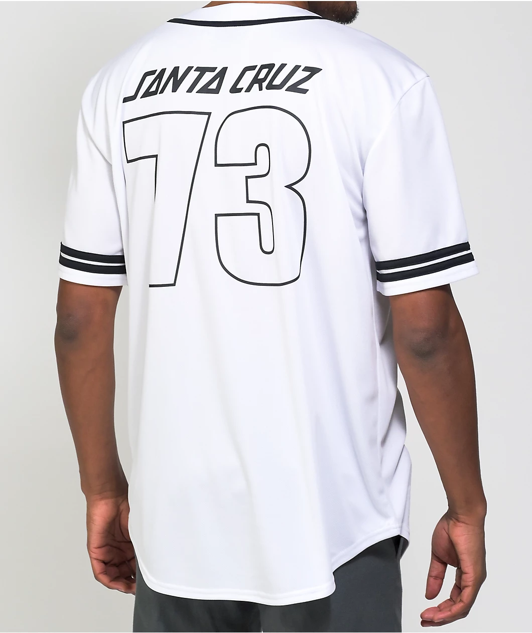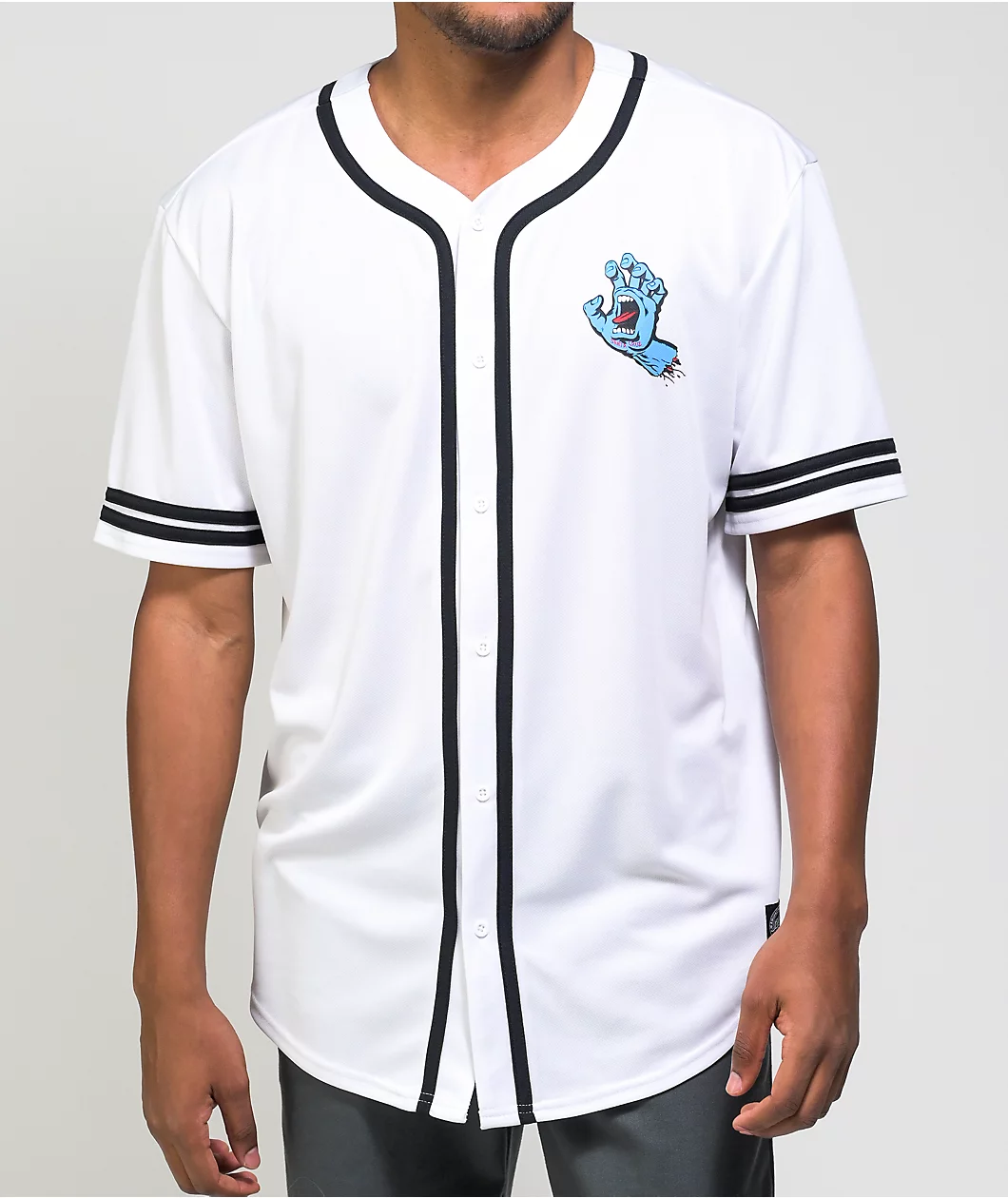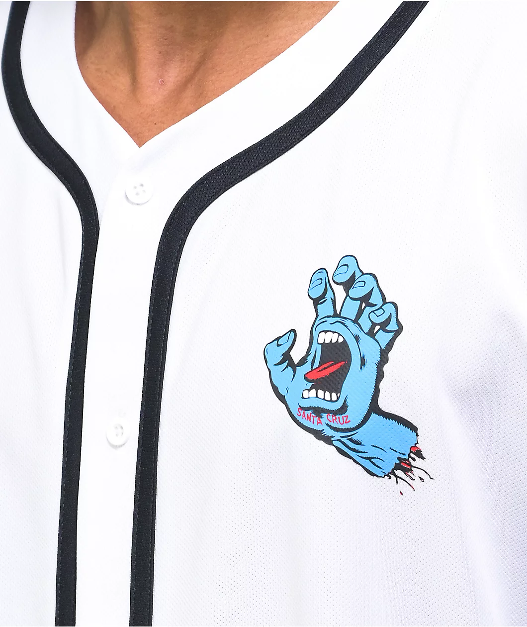 Add some sporty vibes into all your skate-inspired fits with the Santa Cruz Screaming Hand white baseball jersey. This jersey comes in a mostly white colorway complete with black piping for crisp contrast, and the screen-printed Screaming Hand on the left chest and logo script with numbers on the back add an iconic look overall.