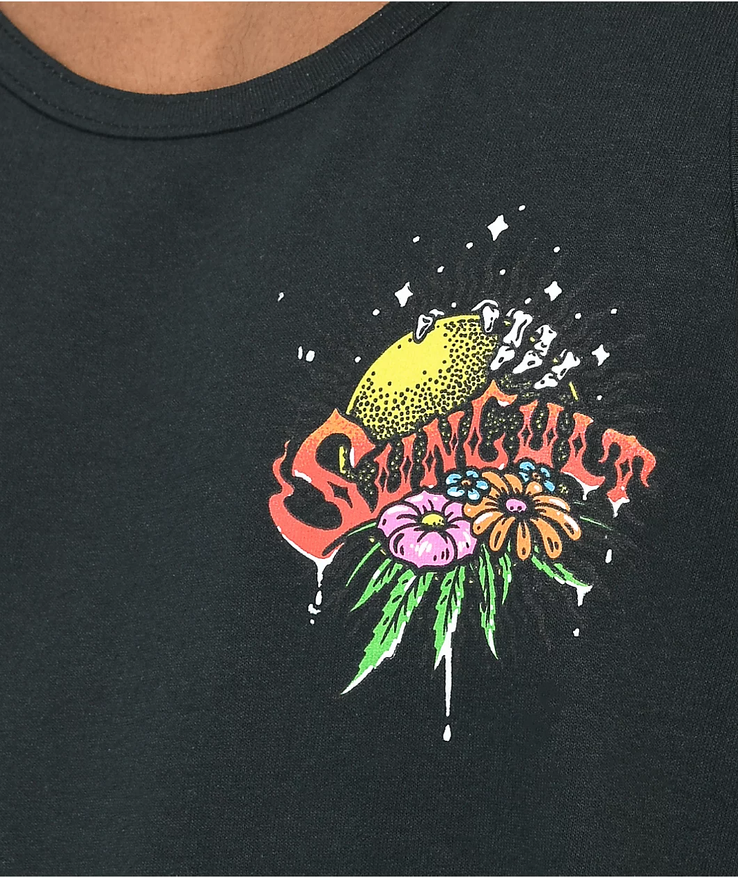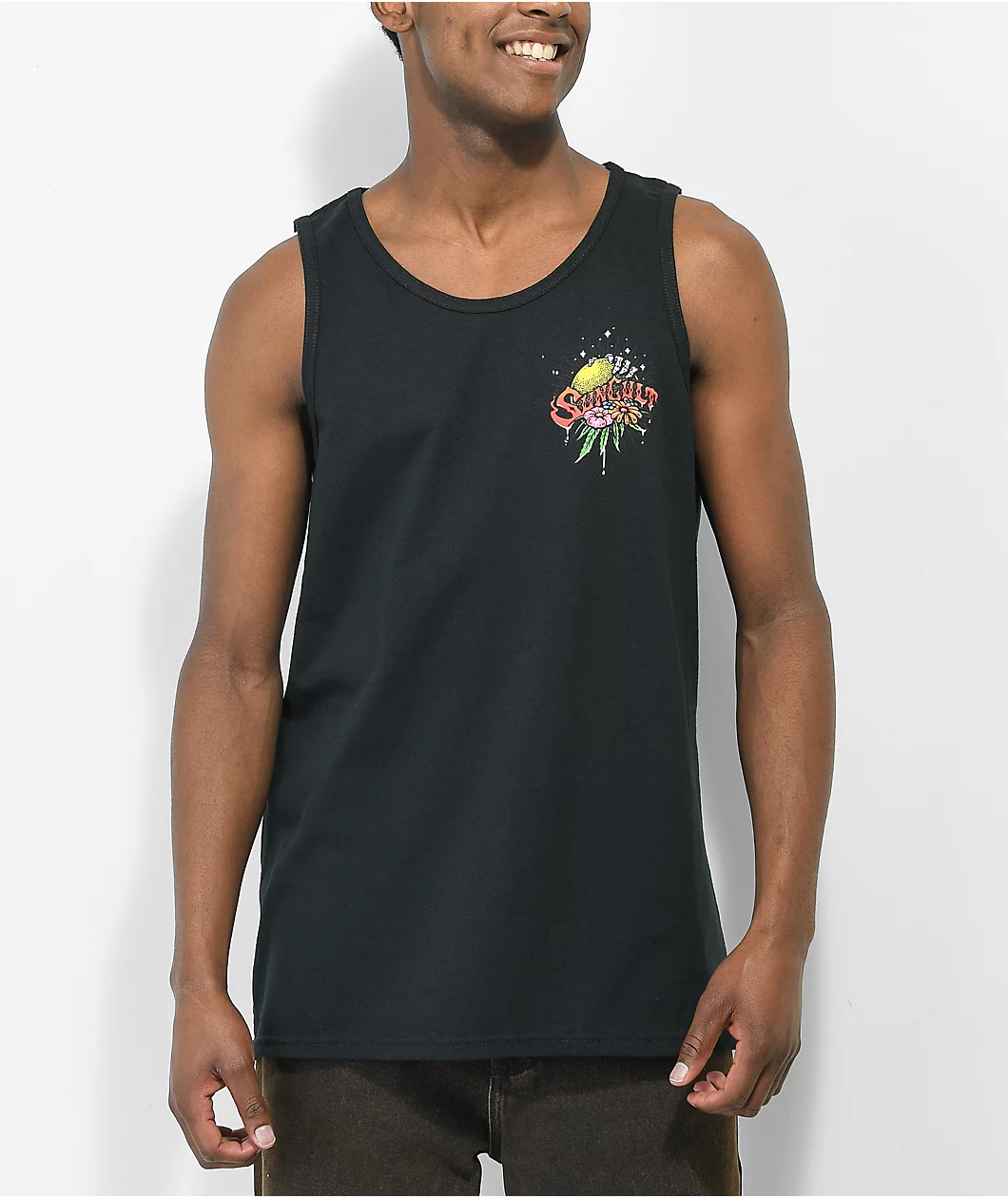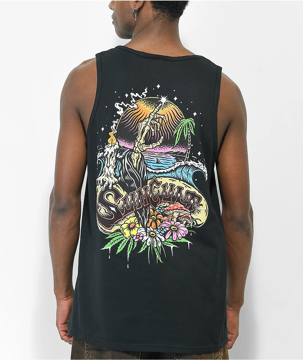 The Reach For It graphic tank top from Suncult comes in black and features a Suncult logo graphic at the left chest of a sun. The back pictures a beach scene with a skeleton hand reaching for a star with flowers and Suncult logo script. A tagless neckline and breathable construction provide a comfortable fit for any casual outfit.