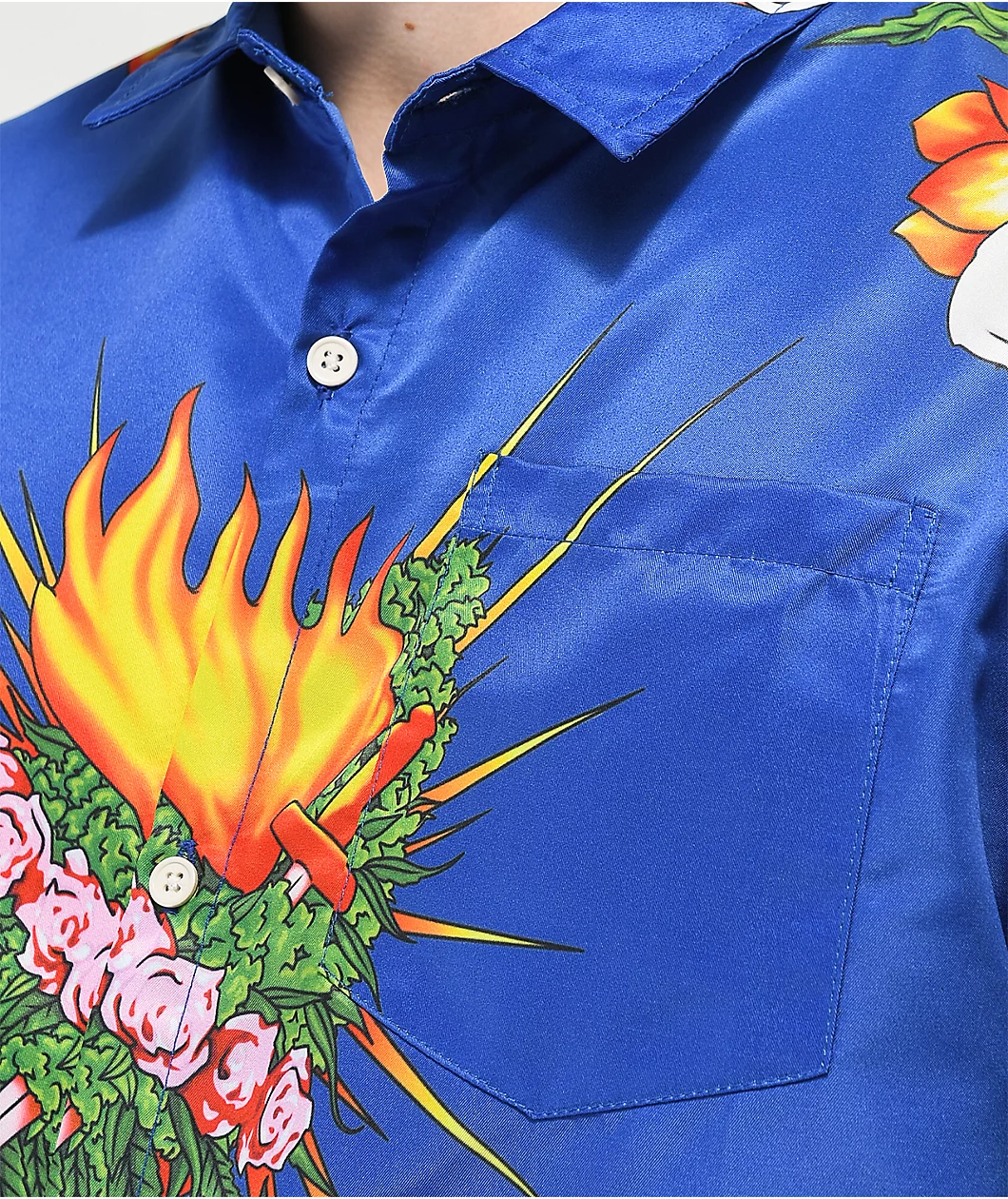 Inspired by the shirt worn by Romeo in the Baz Luhrmann production, the Romeo Tealer shirt comes in a short sleeve, relaxed fit with button up closure and a blue colorway filled with all over print images.