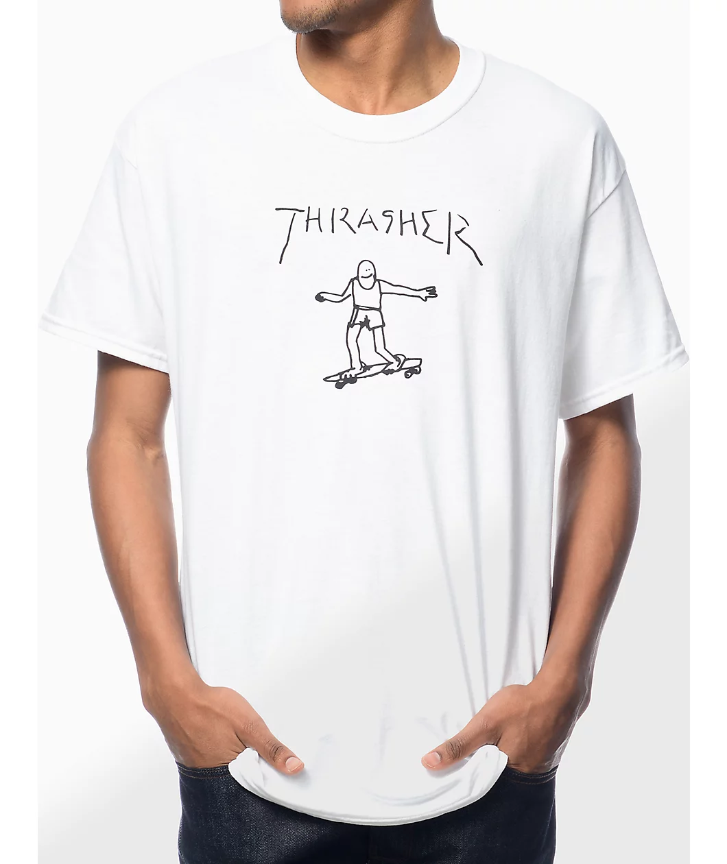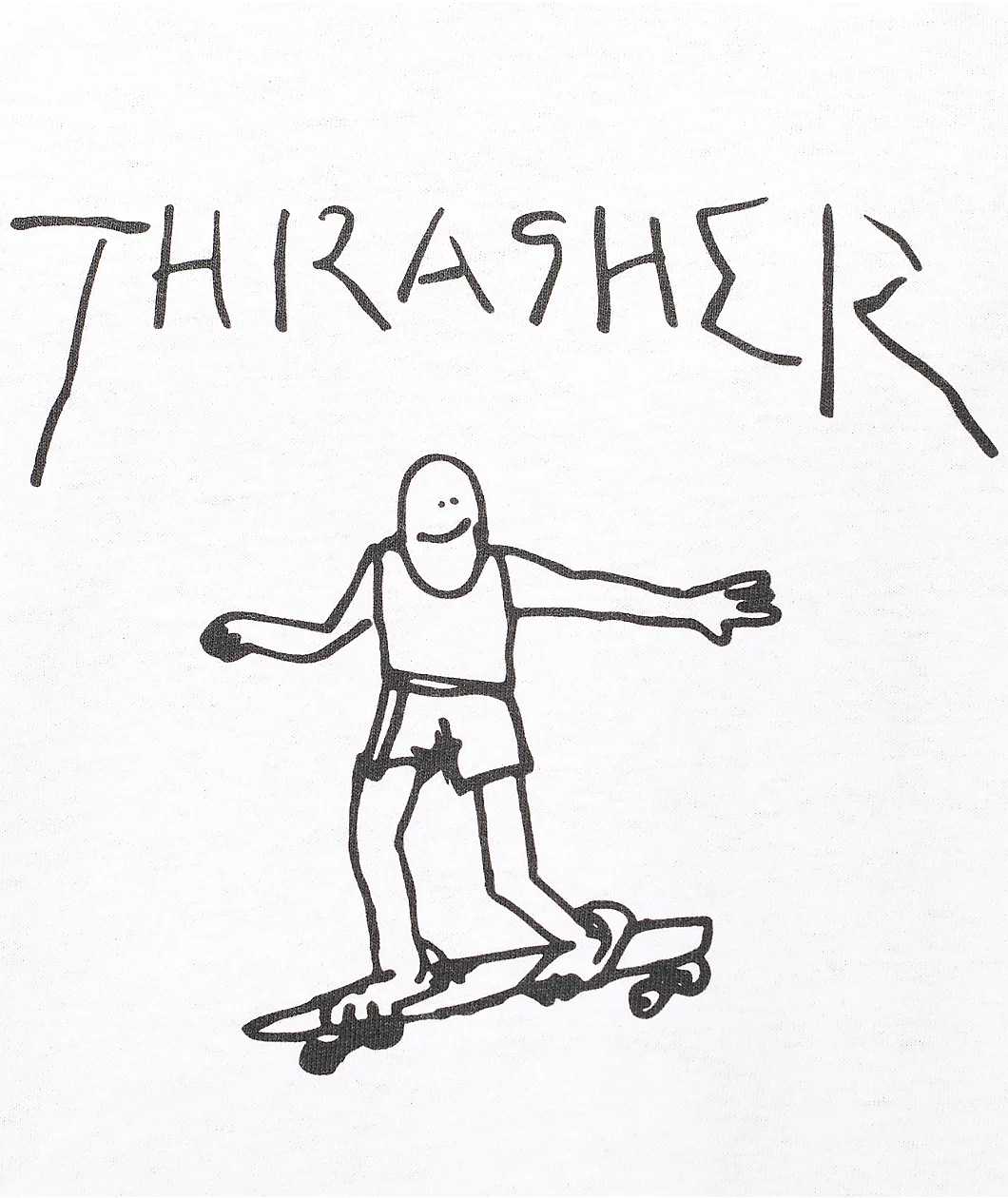Skate in a fun new look from Mark Gonzales with this Thrasher Gonz t-shirt. Keep things light with the custom handwritten Thrasher text and guy skateboarding artwork graphic by Mark Gonzales in a pre-shrunk cotton constructed white colorway.