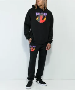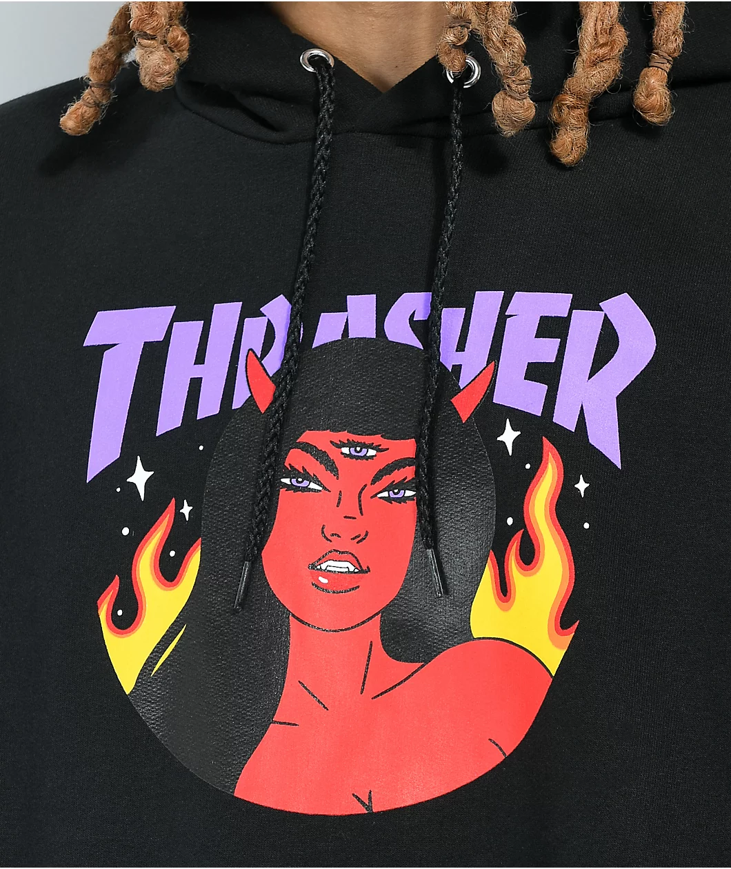The Roja hoodie from Thrasher comes in a clean black colorway with a screen-printed graphic on the chest depicting a red woman with horns and a third eye, flames, and a purple Thrasher logo. This demonic graphic was created by LA based illustrator, animator, and frequent Thrasher Magazine collaborator, Robin Eisenberg. Made from a durable heavyweight cotton blend, the Thrasher sweatshirt comes with a drawstring adjustable hood, metallic eyelets, a kangaroo pocket, and are finished with ribbed hems along the sleeve cuffs and bottom for a classic look.
