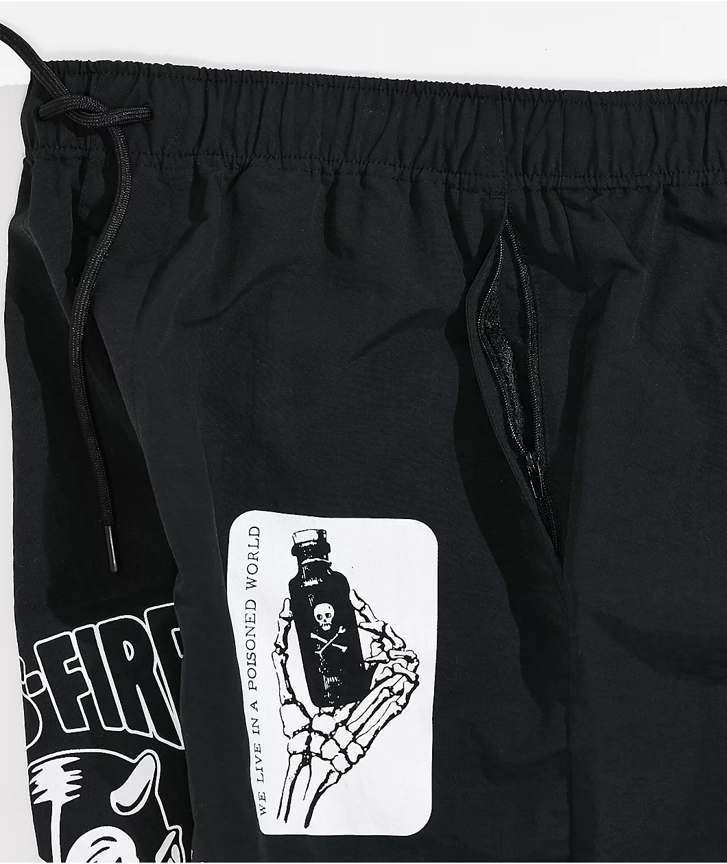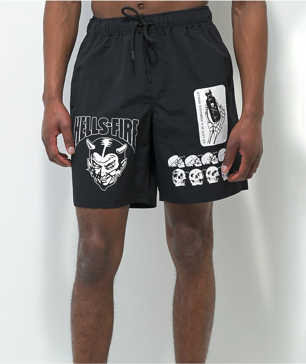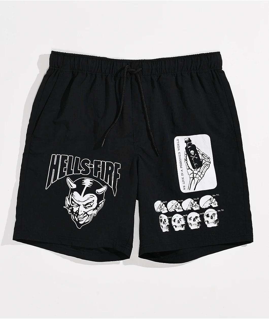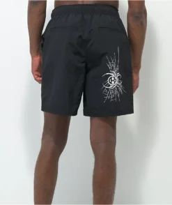 These black Fusion board shorts from Vitriol come in a black colorway that’s outfitted with skulls on the left leg, a devil and “Hells-fire” on the right, and a spider and spider web on the back of the right leg. These swim trunks are made from quick-drying, moisture-wicking nylon to keep you comfortable, and they also have mesh-lined zip-closure hand pockets and mesh-lined hook-and-loop closure seat pockets.