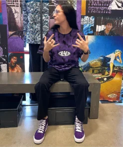 Toss some tumultuous style onto your torso with Vitriol’s Mayhem black and purple tie dye t-shirt. Screen-printed script reading “Chaos” adorns the shirt’s front, providing some stark contrast against the stormy black-and-purple tinged tie-dye treatment dispersed throughout it, while a myriad of images and script situated at the back, including a smirking demon, a snake, a spiderweb, and dialogue reading “Devil In The Details” blend together to lend the shirt some sinister steez.