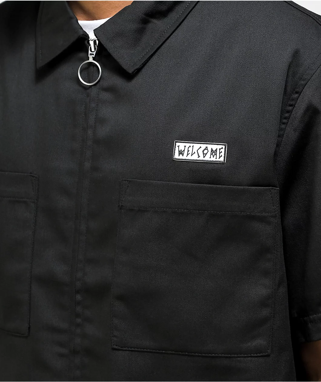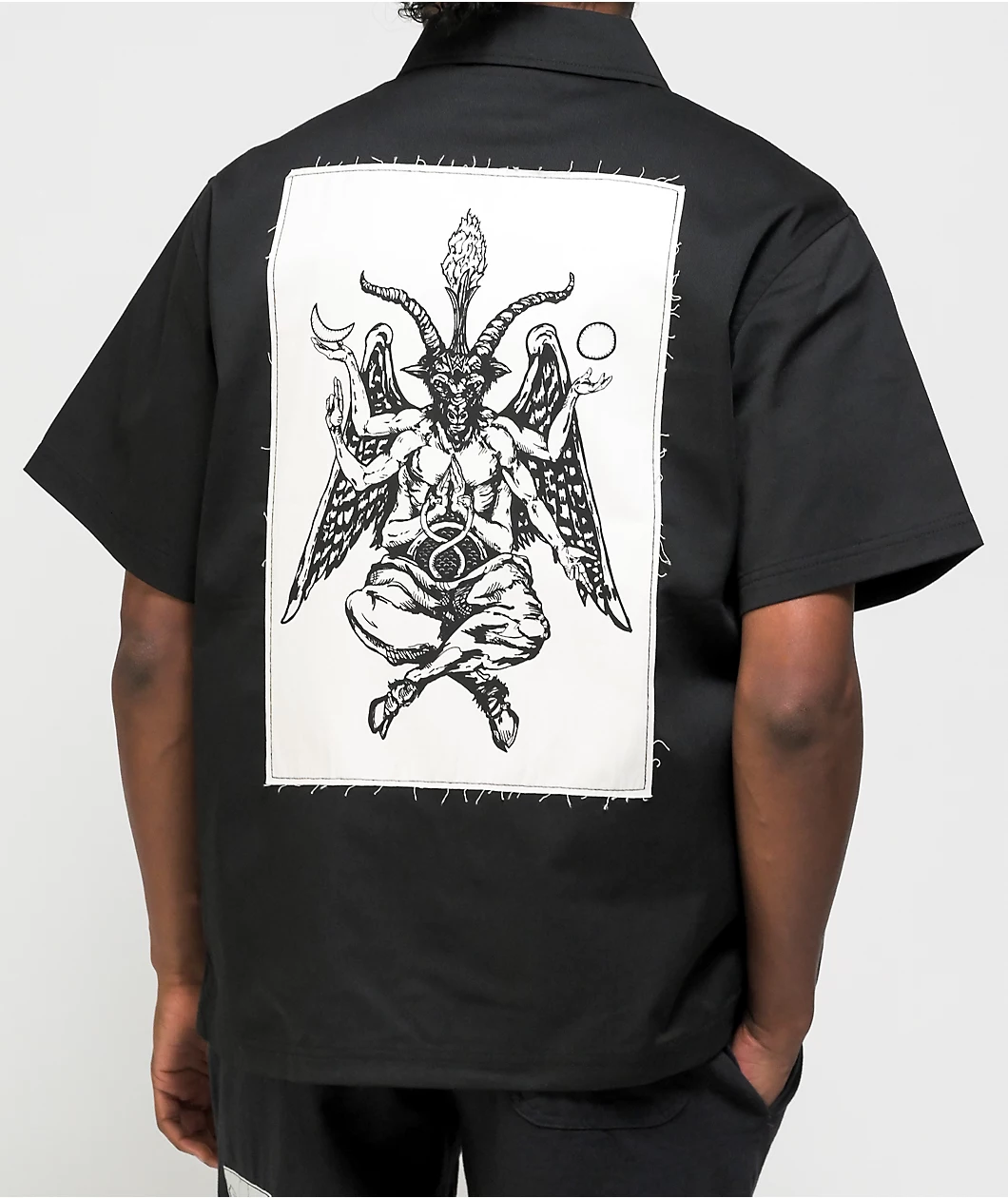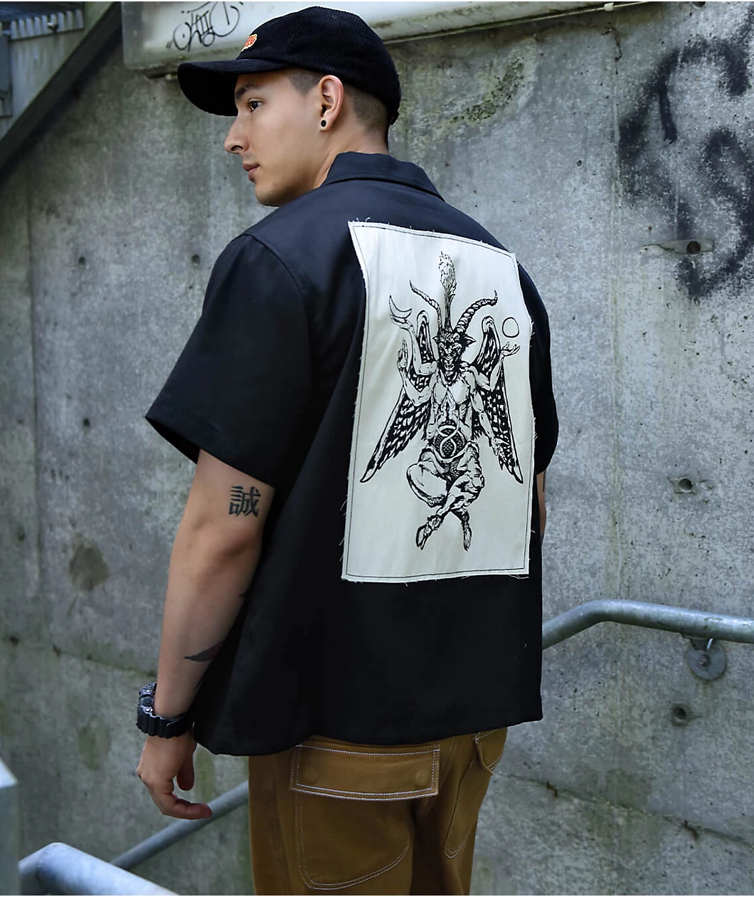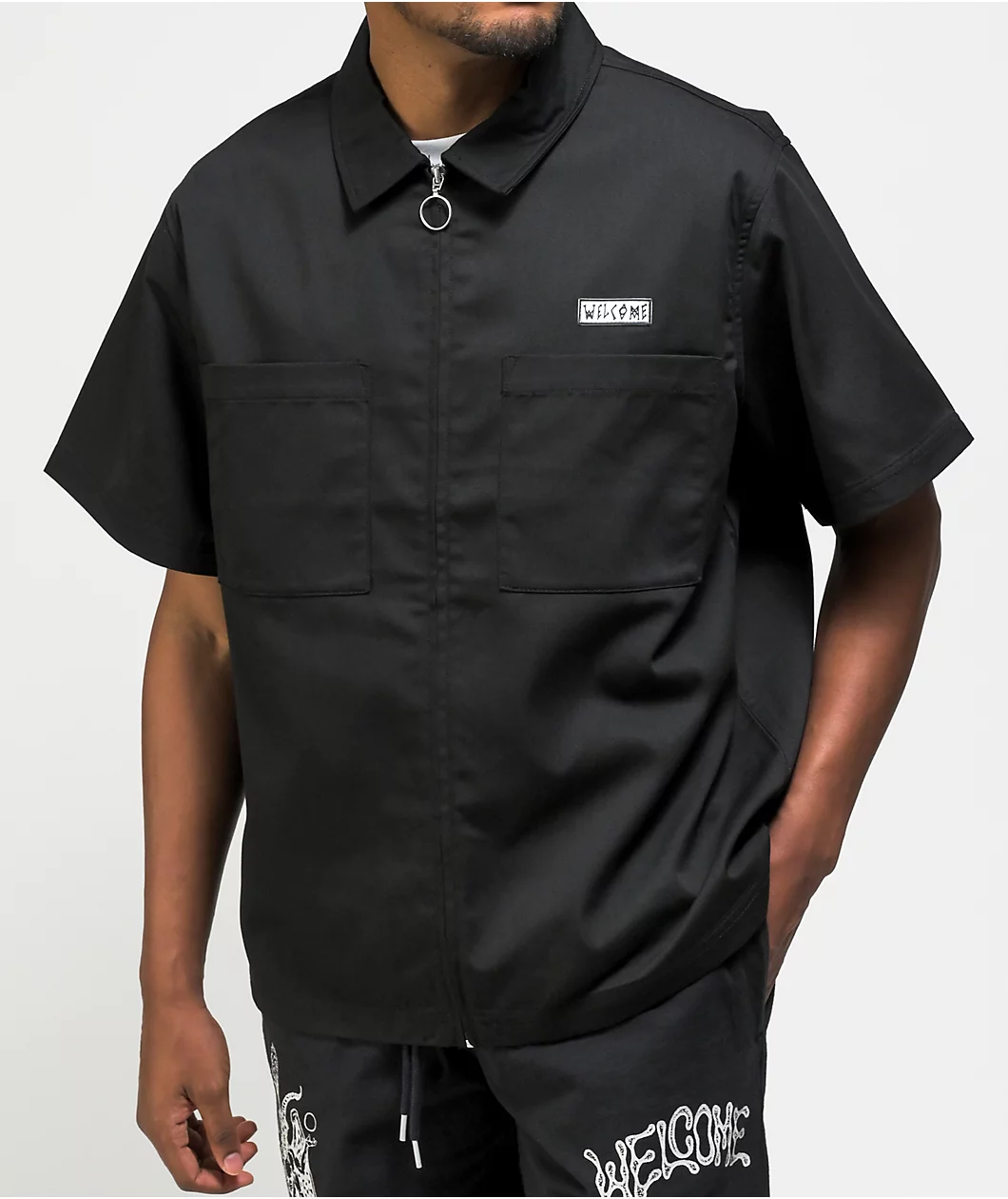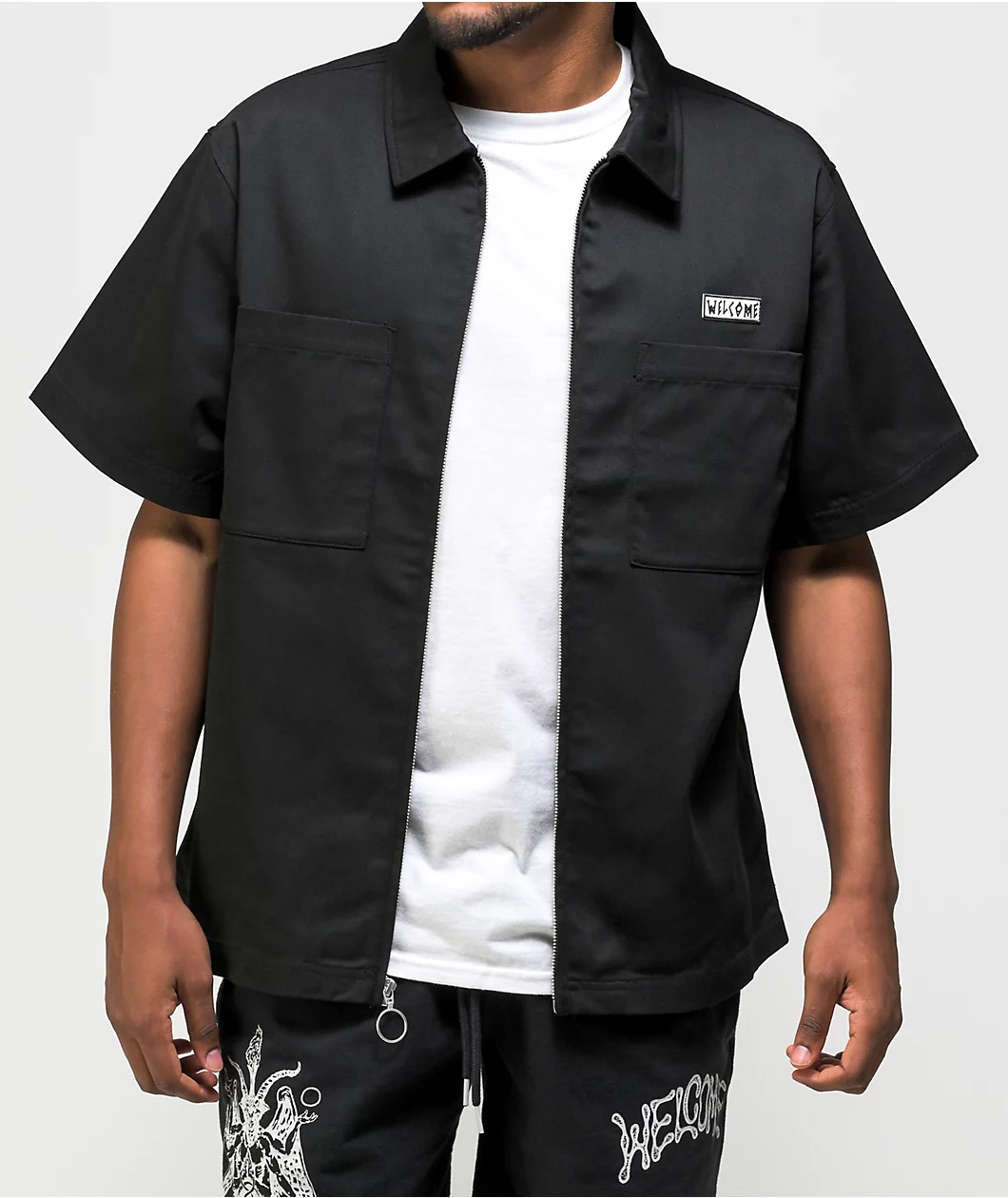 Upgrade those everyday looks with the Bapholit black short sleeve work shirt from Welcome! A unique zip closure allows you to throw this shirt on in seconds flat, while a huge white graphic across the back depicts an unusual beast for some ominous vibes.