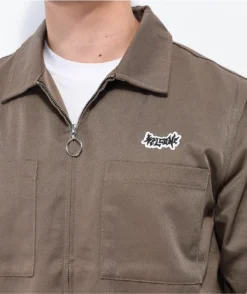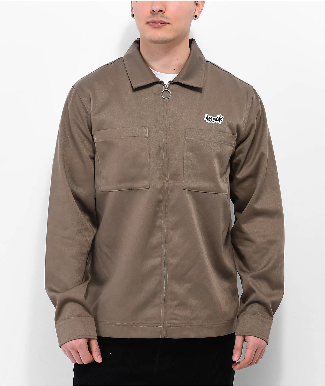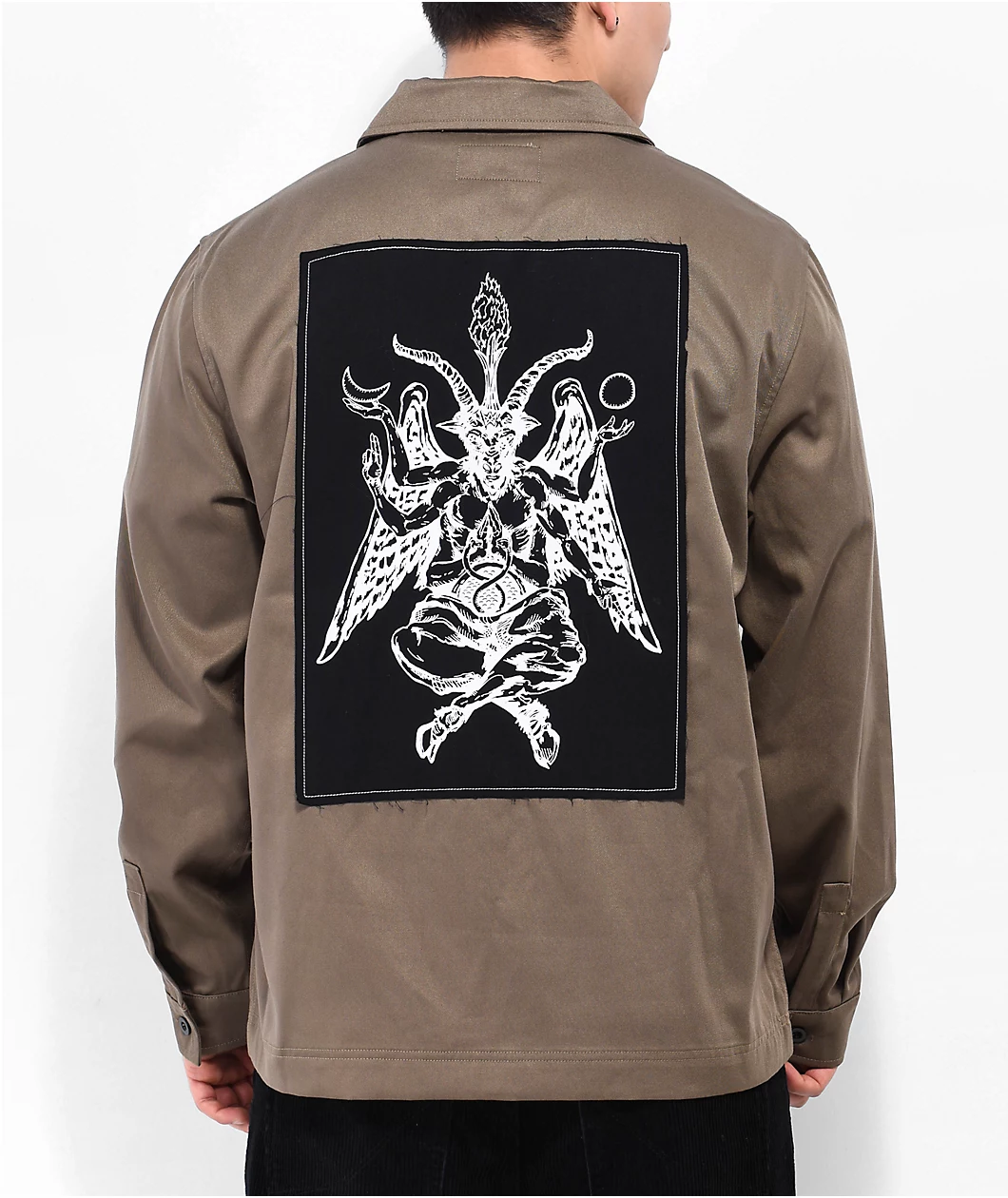 Welcome Skateboards introduces the Bapholit long sleeve work shirt in a dark brown colorway. This shirt features a turndown collar, full zip closure, chest pockets, and button closure sleeve cuffs. The front left chest boasts a rubber Welcome patch just above the left chest pocket, while the back features a large, black patch with a graphic of Satan.