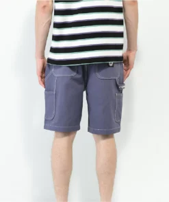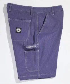The Brace Welcome carpenter shorts are made of 100% cotton, and come in a soft, purple colorway with white stitching throughout as well as a white brand name on the side and a black, rubber brand patch on the back, right pocket. These shorts have classic button-and-zip closure and a 7-pocket construction with a hammer loop on the right side for easy storage.