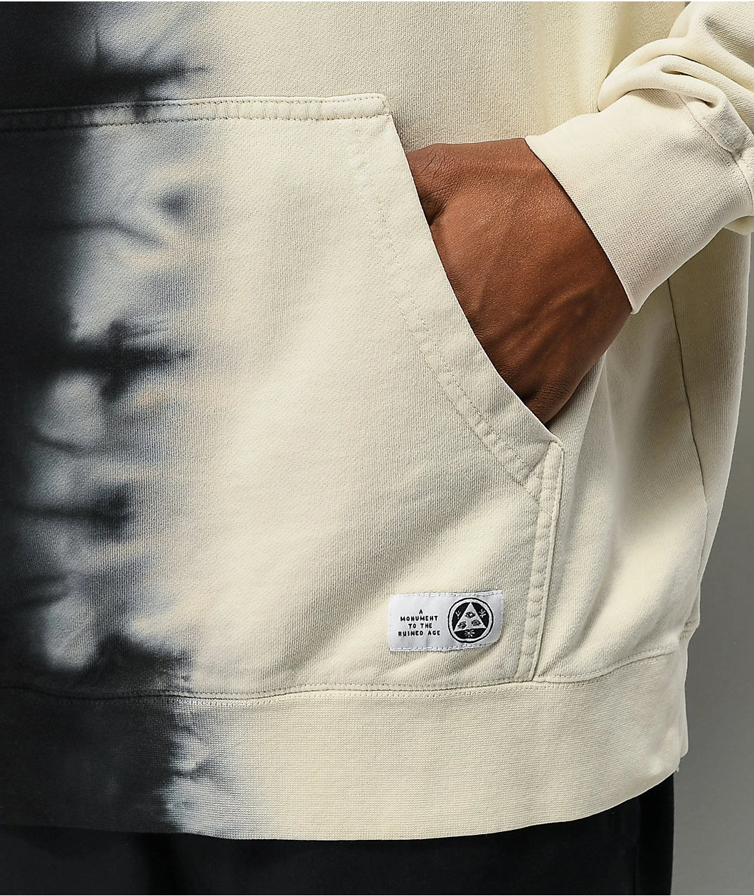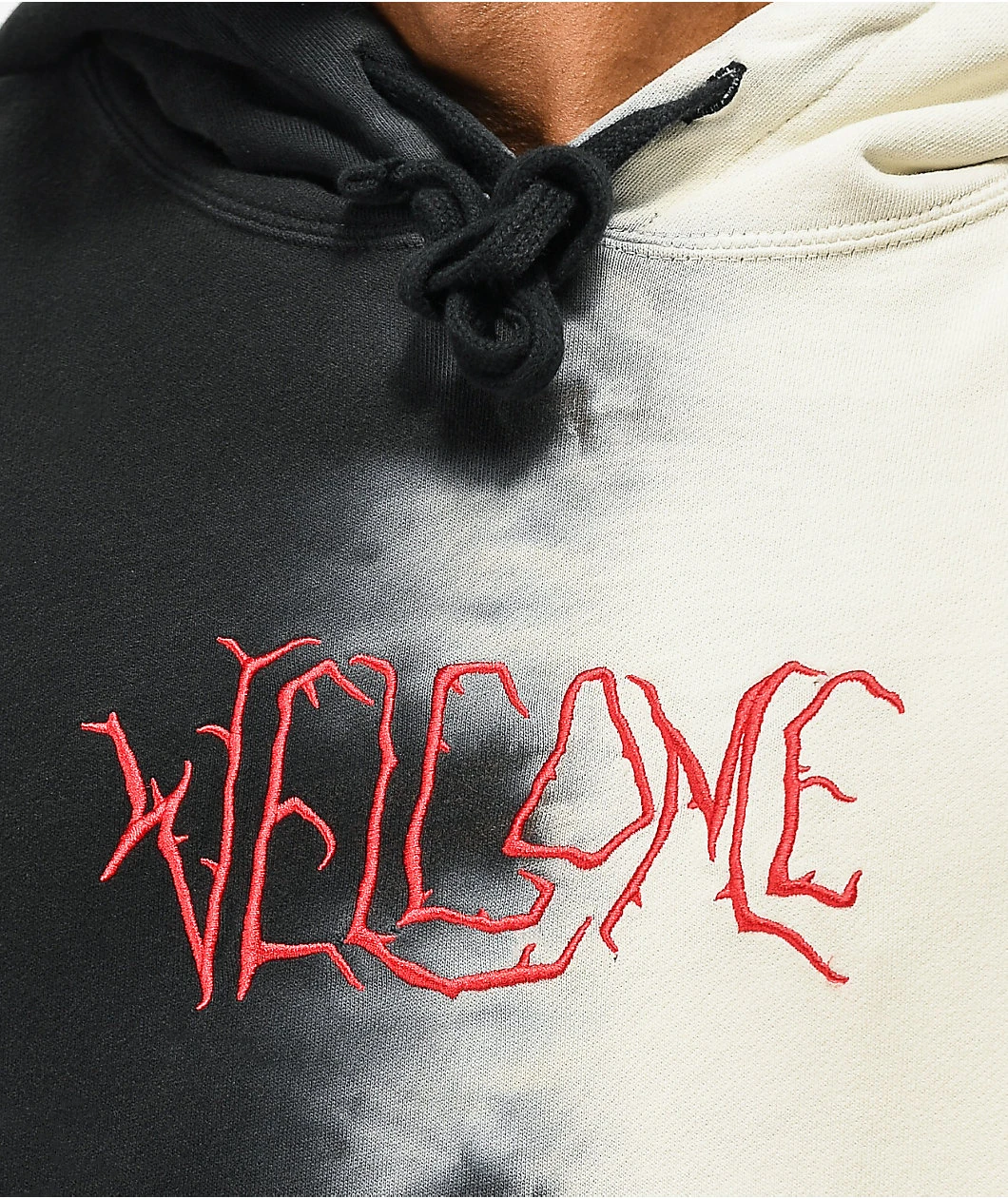 Feel stylish & cozy with the fashion-forward Chimera bone dip-dyed white & black hoodie from Welcome. This hoodie comes in an alluring creamy white & black dip dyed colorway that splits & meshes down the middle giving it an epic pop of contrast against the embroidered red branded logo across the chest. Featuring a soft fleece lined interior & ribbed sleeve cuffs plus a ribbed bottom hem, bask in the comfort & worthy-style with this hoodie from Welcome.