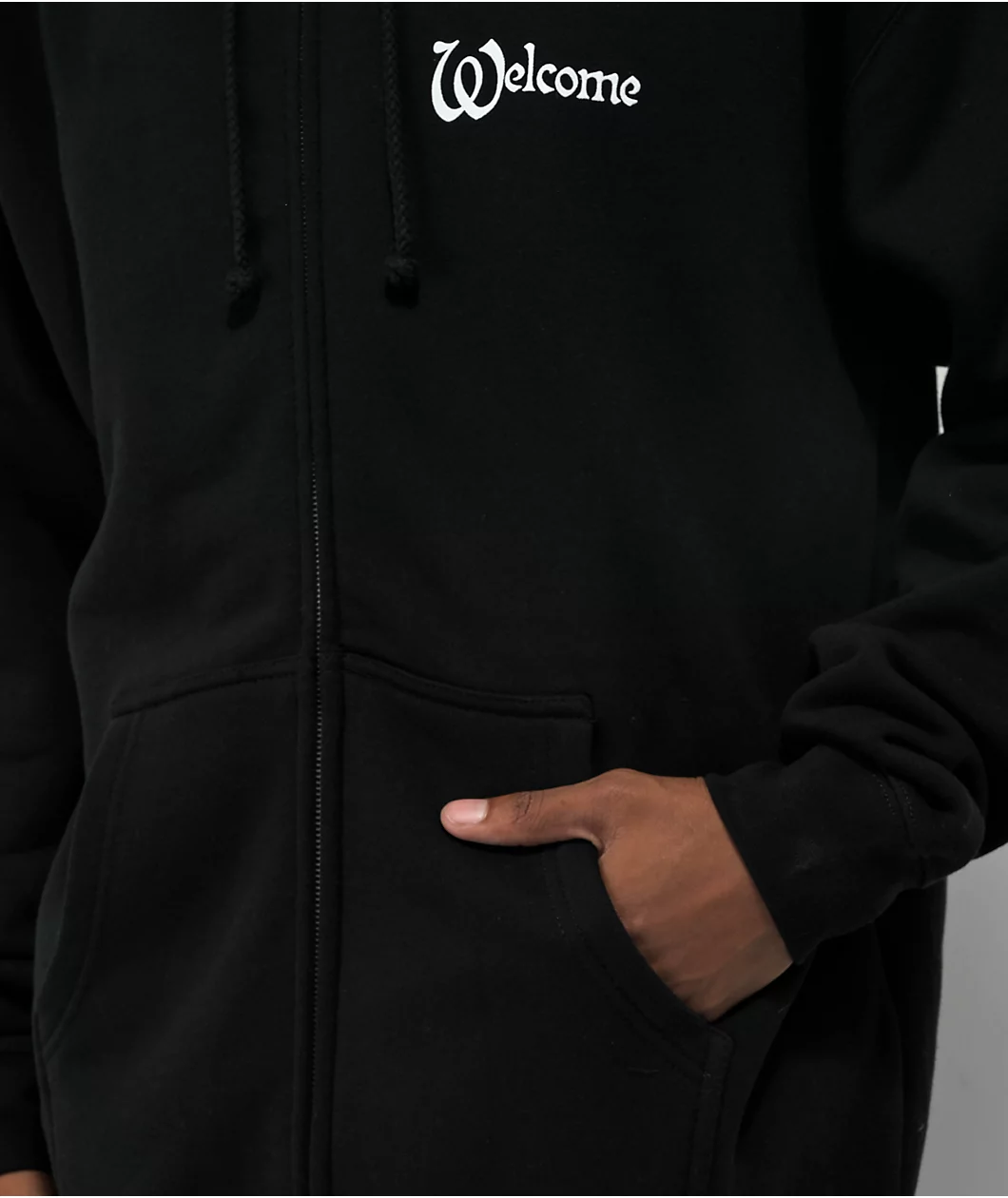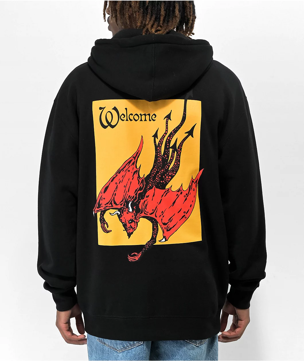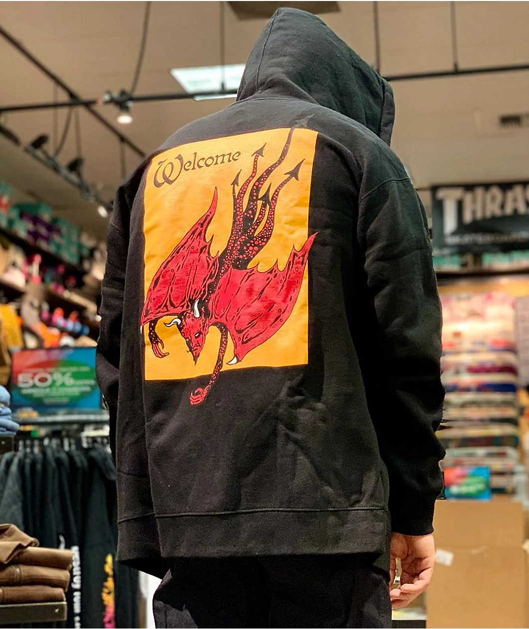 From Welcome comes the Unholy Diver zip hoodie in a black colorway, giving subtle branding with script left of chest. On the back a colorful graphic of a multi-tailed demon flying through the air gives bursts of color in golden yellow and red. This hooded sweatshirt offers storage through dual slash hand pockets, while making layering easy with a full zip closure. An adjustable drawstring hood offers a snug fit, coming complete with a cotton-poly construction that keeps you comfy-cozy and stands the test of time.