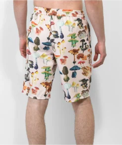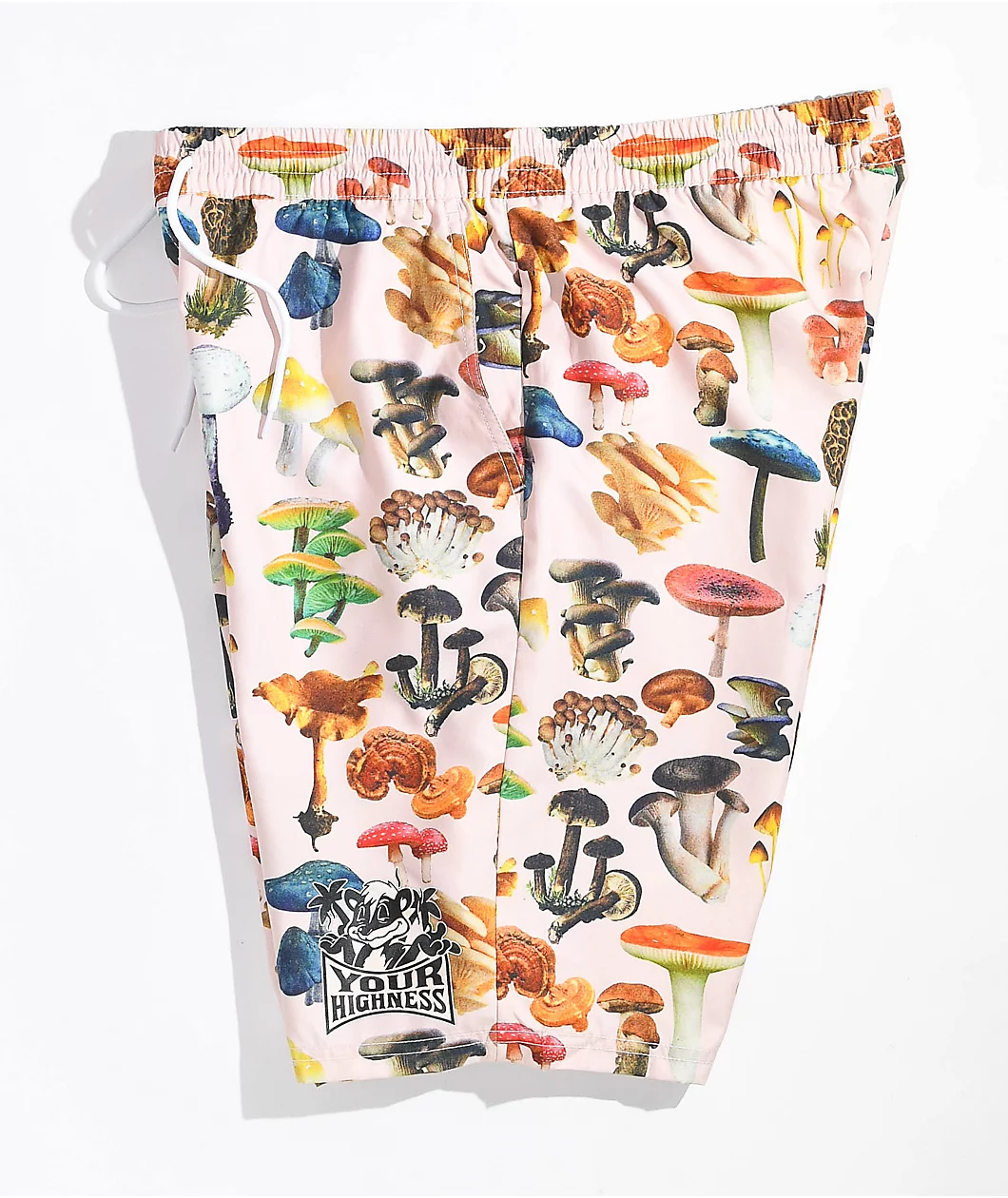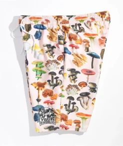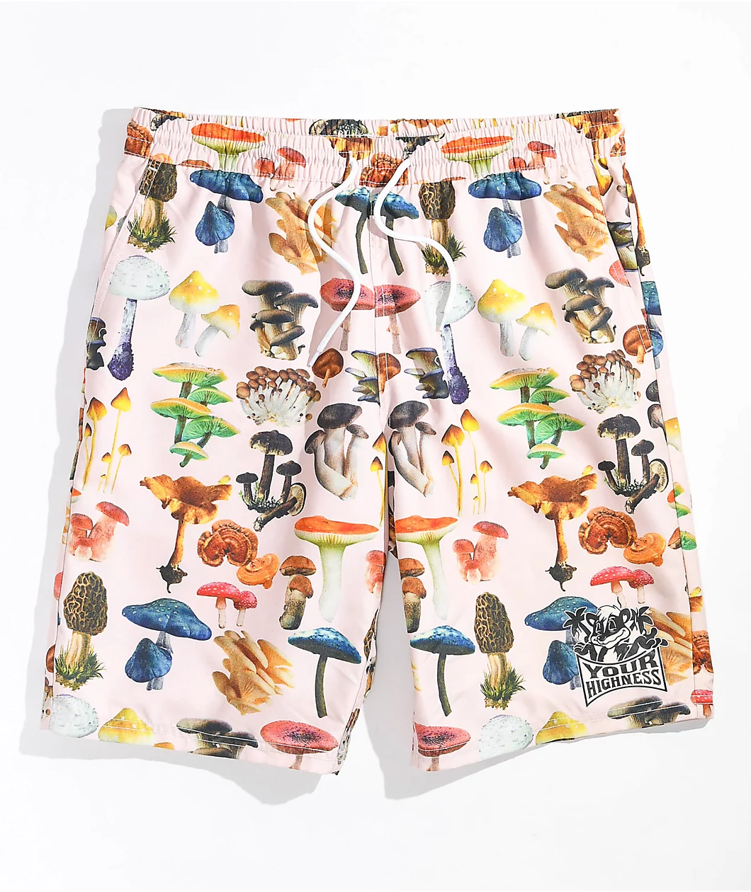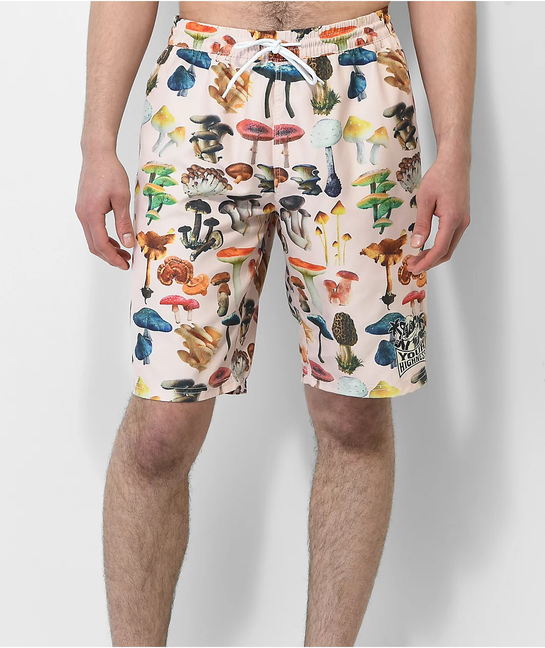 The LA Spores Your Highness board shorts have a natural colorway replete with colorful sublimated graphics of dozens of mushroom strains. Made from lightweight, quick-drying polyester, these swim trunks are perfect for the beach, the pool, or just hanging out. They have an elastic waistband with an external drawstring, two slash hand pockets, and are cut above the knee for unrestricted movement.